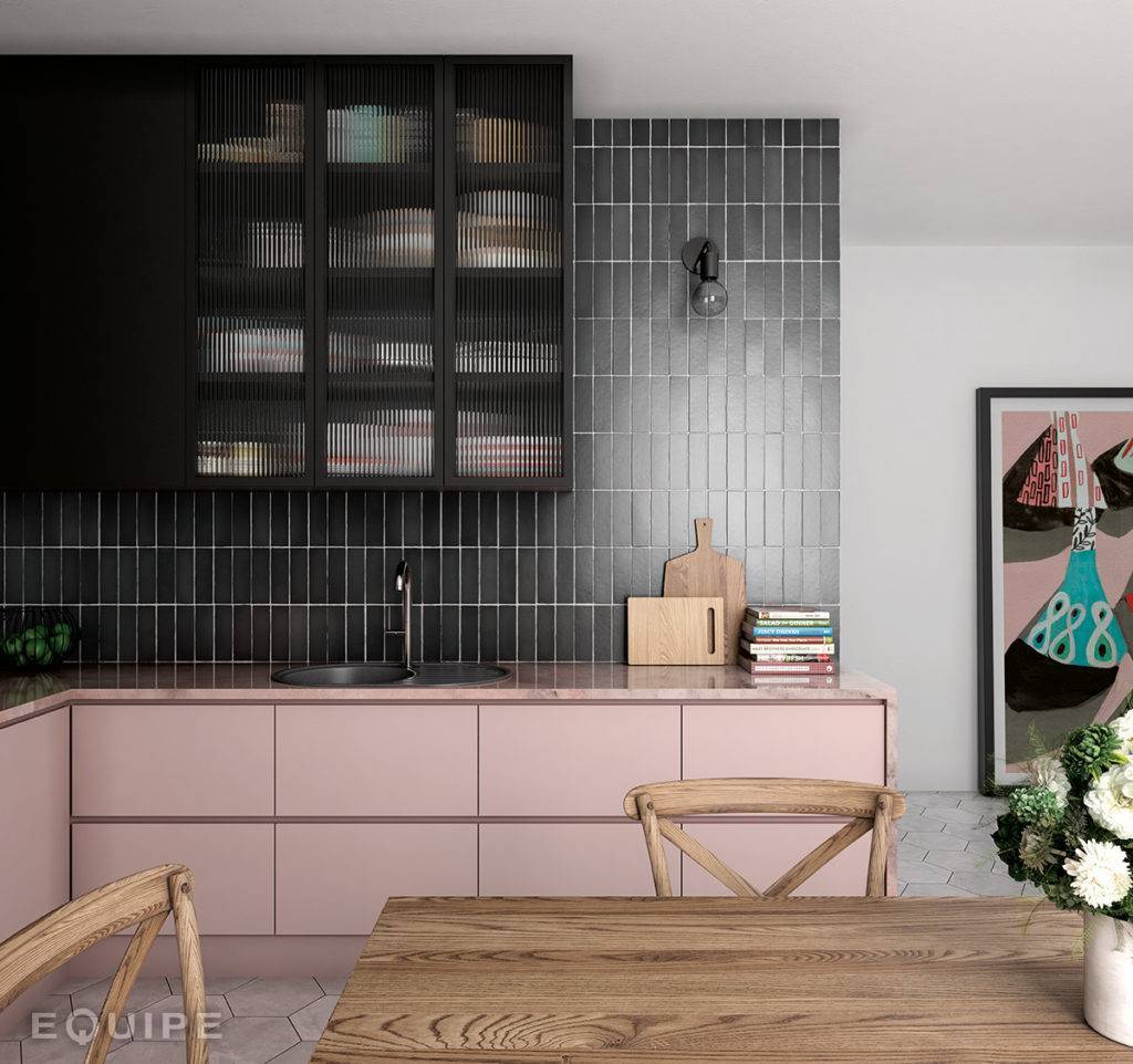 Розовые тона стали всё чаще использоваться для кухни-столовой. Возможно, не последнюю роль сыграли ассоциации с пирожными, леденцами, а может факт того, что кухня, как правило, женское царство. Создаются помещения с разной эмоциональной окраской: