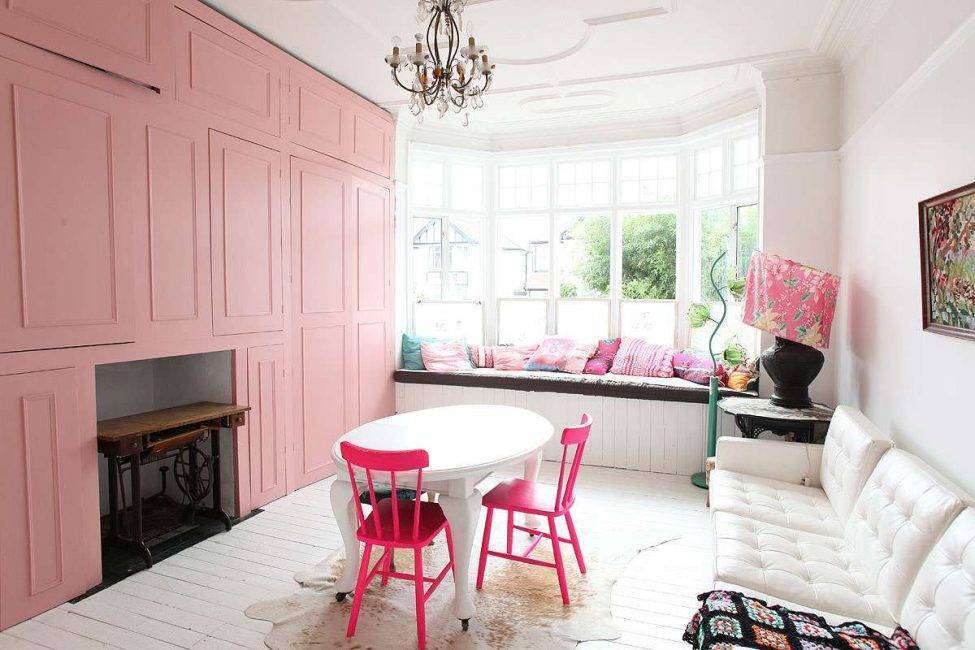 Розового цвета может быть отделка мебели, одна стена или ее фрагмент. Для некоторых стилей таким цветом окрашивают винтажную мебель, например, старинные комоды или громоздкие шкафы с красивыми металлическими ручками или кресла с мягкой бархатной обивкой.