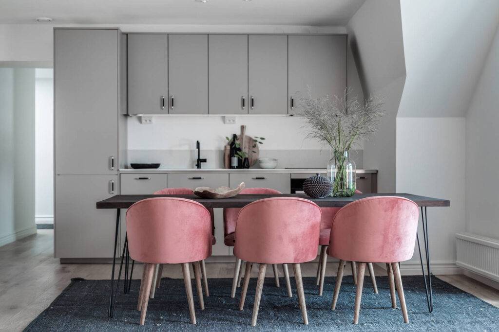 Подойдет этот оттенок розового для столовой и кухни: он не оказывает влияние на аппетит и настроение, создает расслабляющую, спокойную атмосферу. Внутри гостиной используется в виде акцентов. Это могут быть подушки, занавески, скатерть, обивка, картины, абажуры.