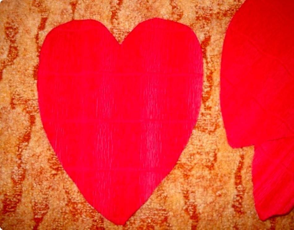 При создании таких цветов не обойтись без белого картона, красной и зеленой гофробумаги, тонкой проволоки, клея. Для начала нужно вырезать картонные шаблоны для лепестков. Они должны получиться в форме капельки. Длина – 24 см, ширина (в самом широком месте) – 9 см. Еще один шаблон вырезать в форме сердечка (24х18 см).