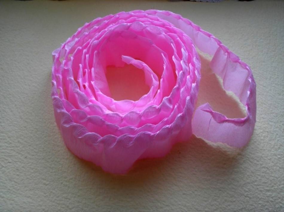 Из гофробумаги (розовой и бардовой) сделать полоски 40 см в длину и 5 см в ширину. С одной стороны загнуть бумагу раз, потом – еще и так до самого конца. При этом нужно постараться, чтобы полоска при загибании принимала волнообразную форму.