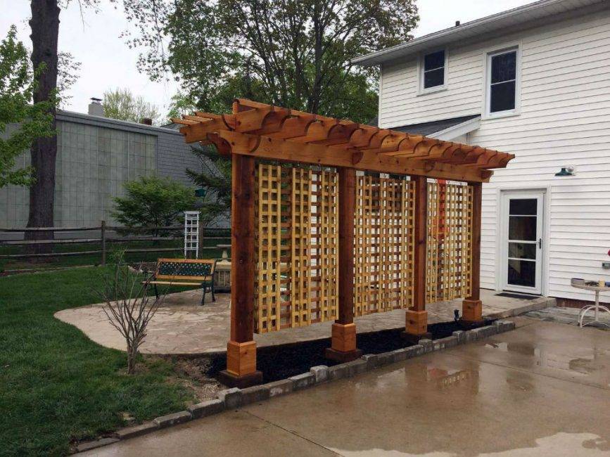 Перголу можно установить не только в глубине сада, но и пристроить своими руками к дому. Кто-то приобретает разборную конструкцию и по инструкции-проекту устанавливает ее на участке. А кто-то делает все с нуля сам, используя, например, древесину хвойных пород.