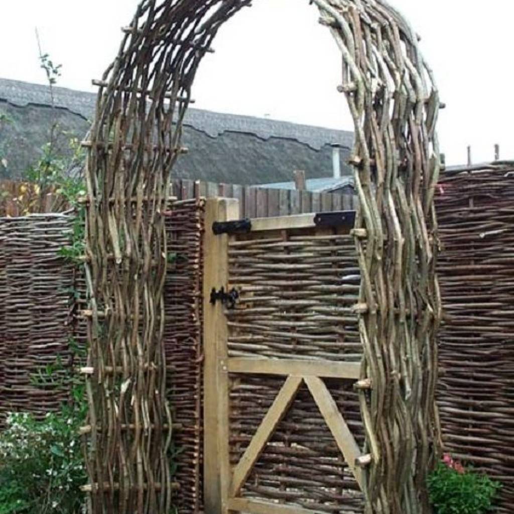 Из других материалов самым популярным остается лоза. Плетеная арка или пергола станет акцентом проекта в стиле кантри. Конструкция из бамбука уместна в саду с восточным колоритом. Арочный плетень недолговечен, темнеет, проседает. Около такой арки высаживают только легкие однолетники, не создающие большой нагрузки.