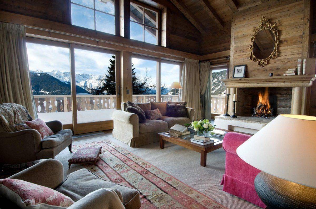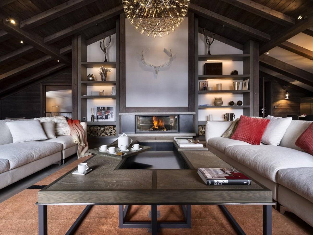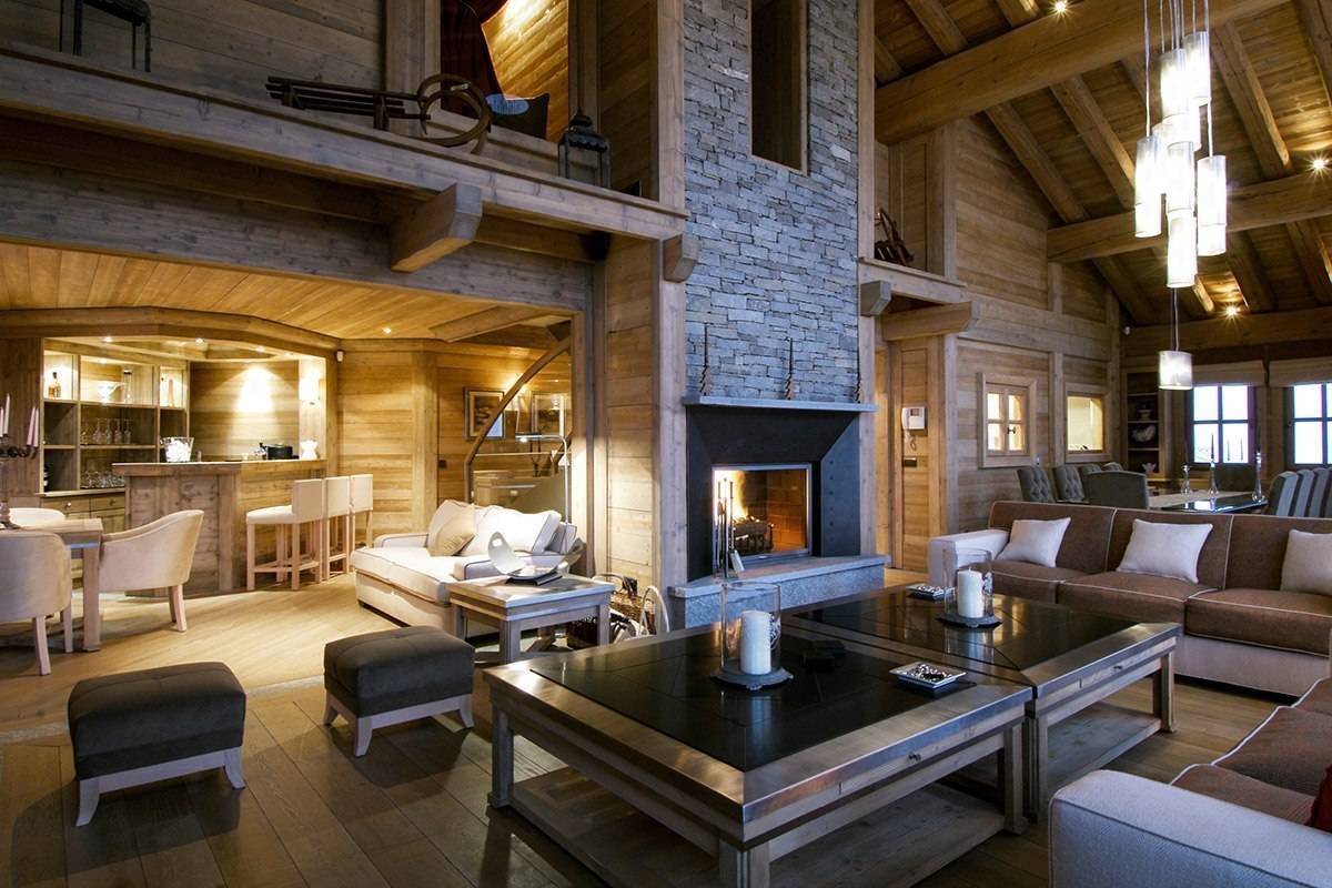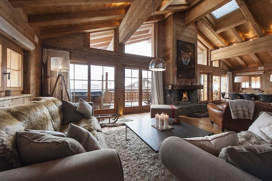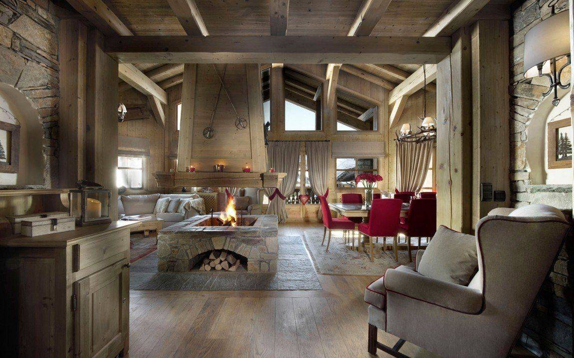Гостиные шале создают теплую атмосферу домашнего огня. Доминирующие цвета — красный и зеленый. Стены из балок, деревянные полы и потолки, скрипучие лестницы и массивные, часто резные поручни — это основа горных интерьеров. Сердцем дома является, конечно же, камин — кирпичный, а чаще всего чугунный. Свечение огня дополнительно согревает интерьер и заставляет дом быть более уютным и безопасным.