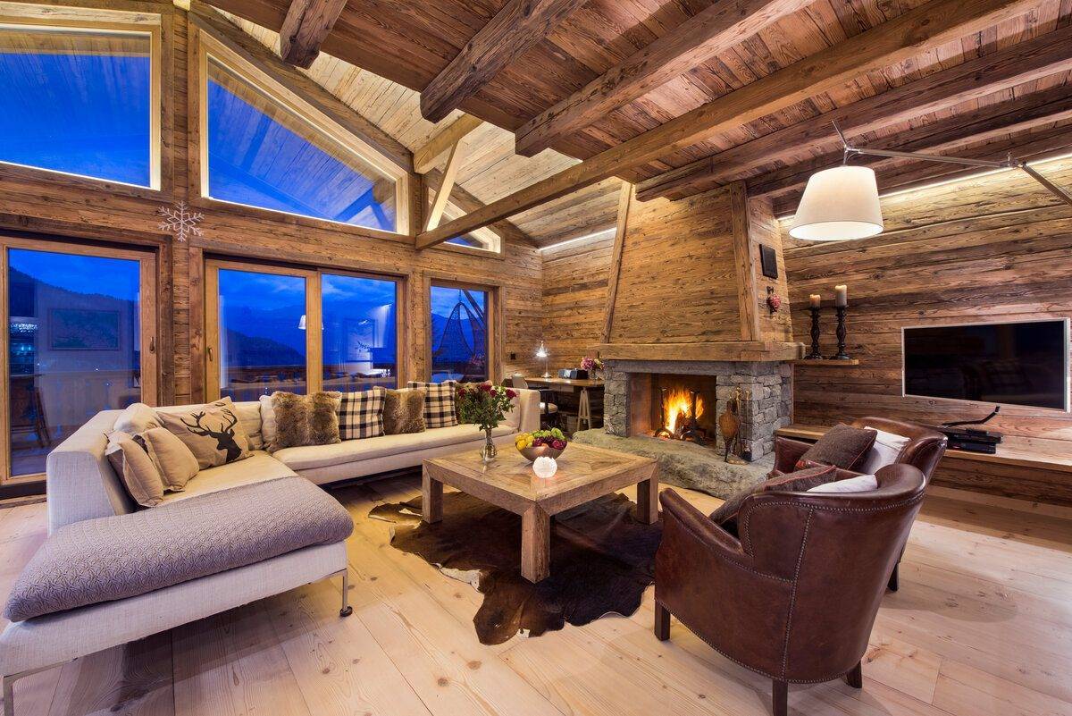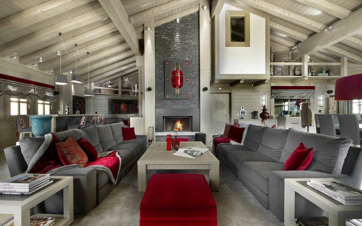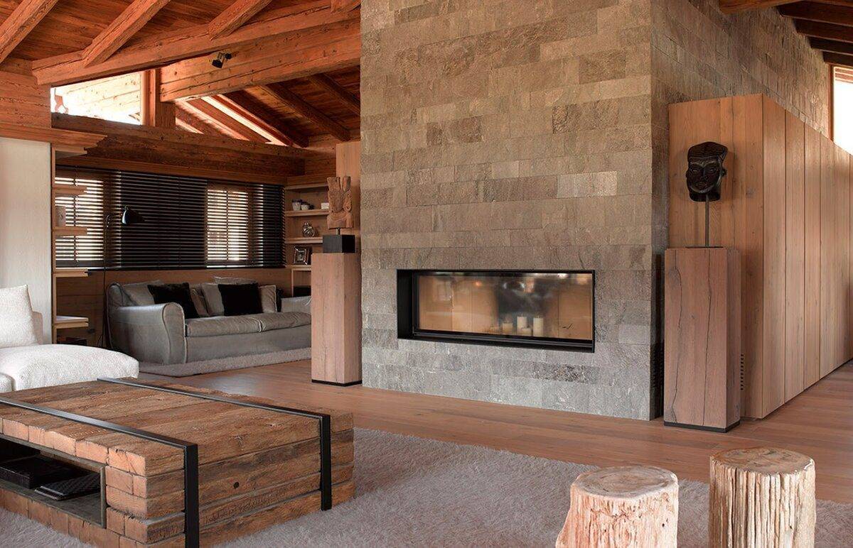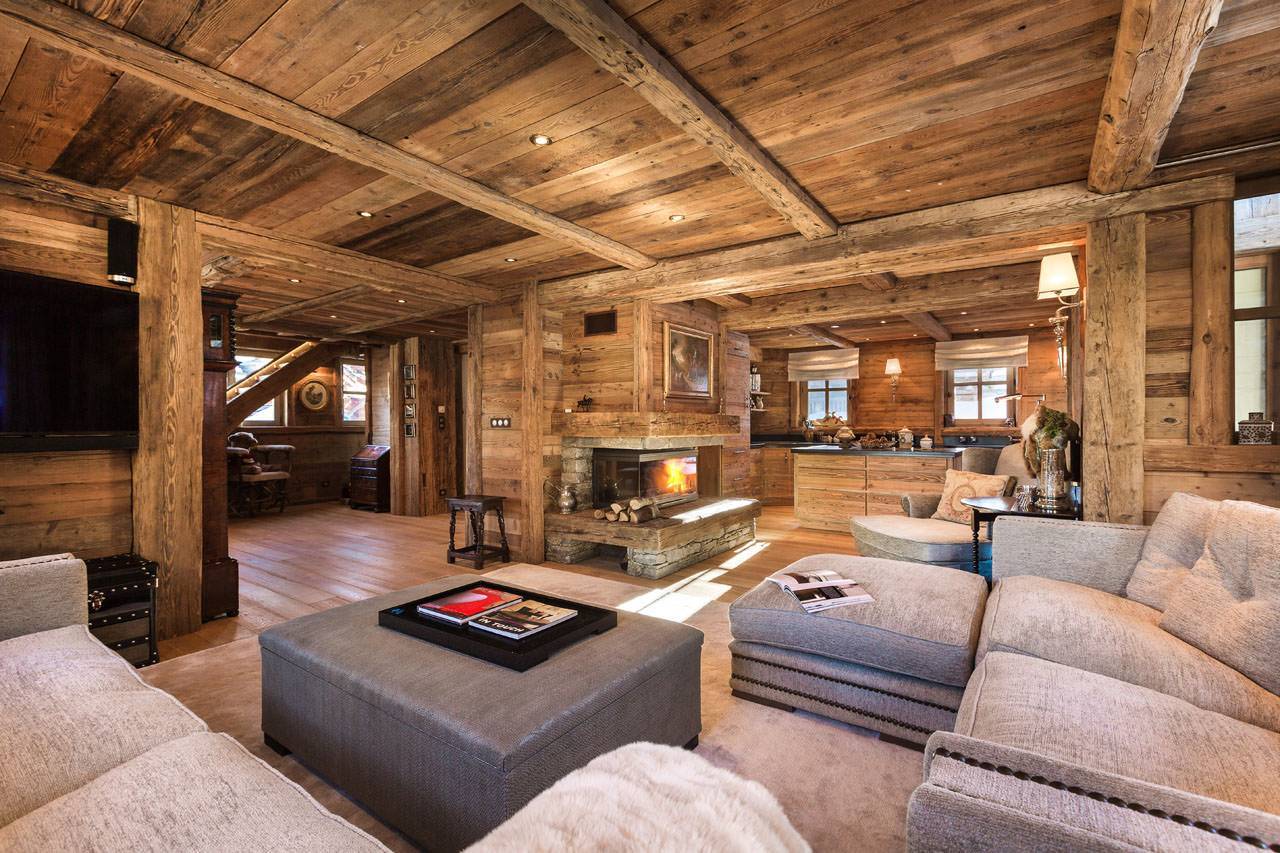 Гостиные шале создают теплую атмосферу домашнего огня. Доминирующие цвета — красный и зеленый. Стены из балок, деревянные полы и потолки, скрипучие лестницы и массивные, часто резные поручни — это основа горных интерьеров. Сердцем дома является, конечно же, камин — кирпичный, а чаще всего чугунный. Свечение огня дополнительно согревает интерьер и заставляет дом быть более уютным и безопасным.