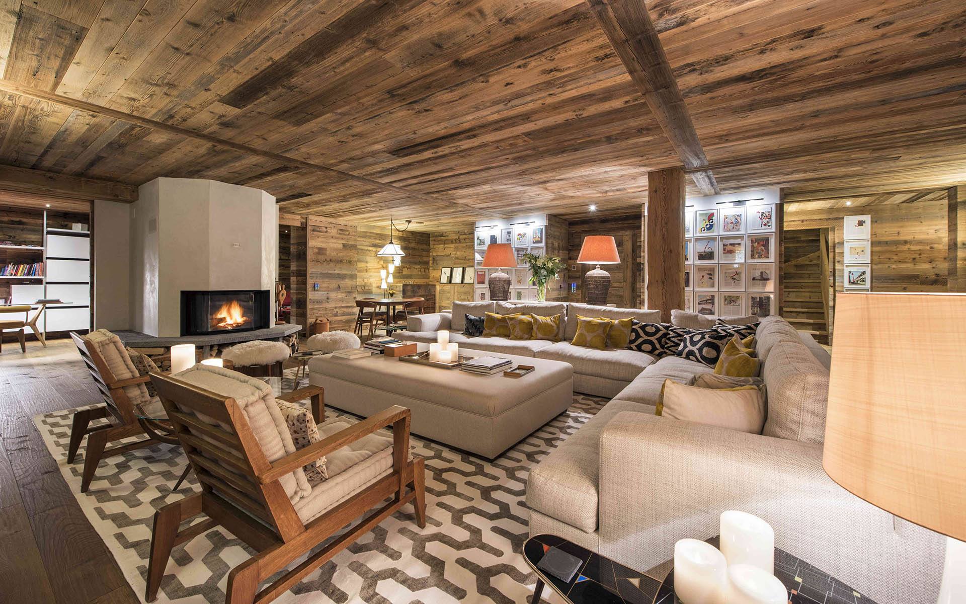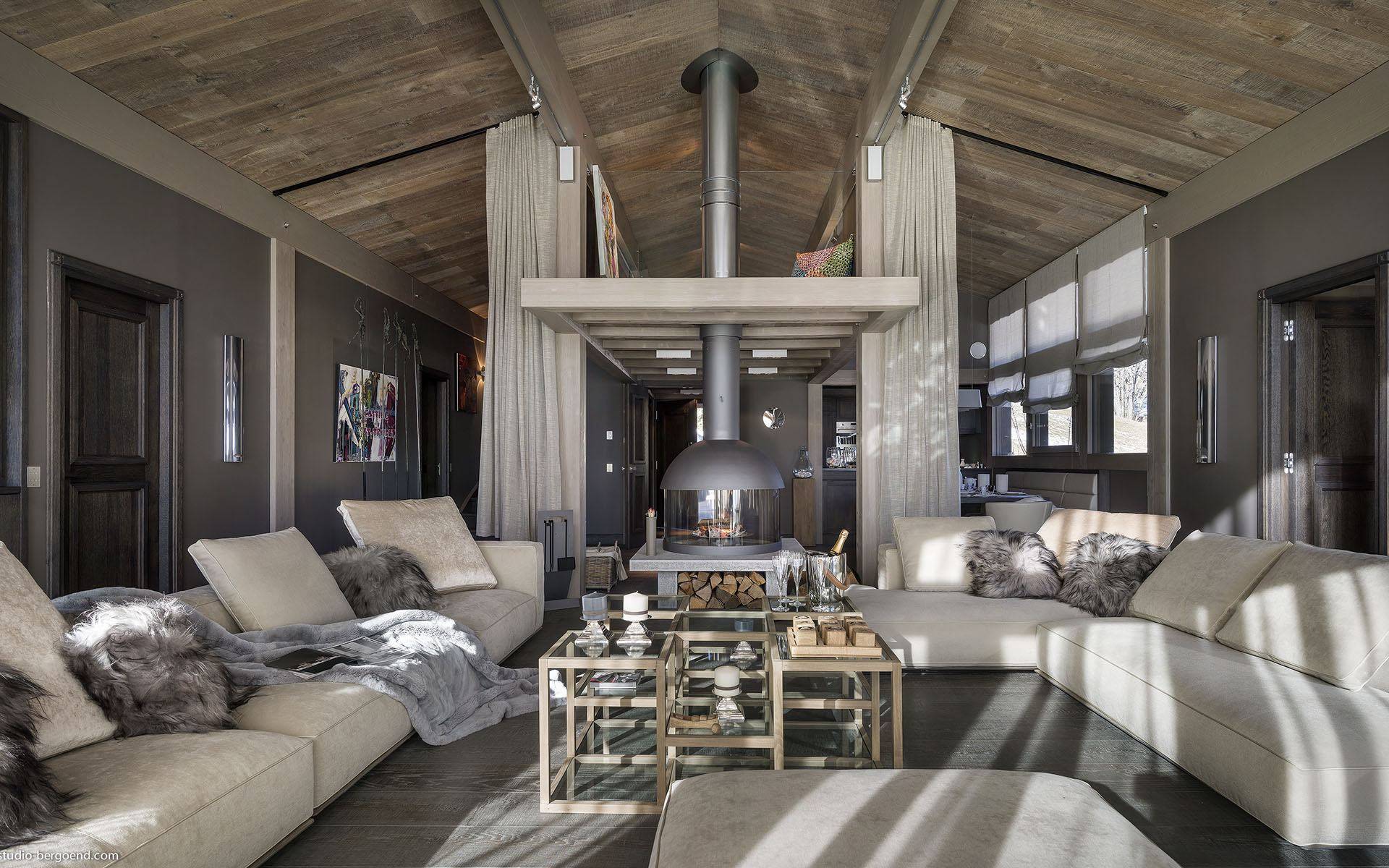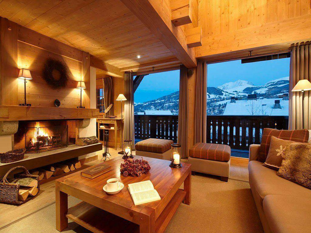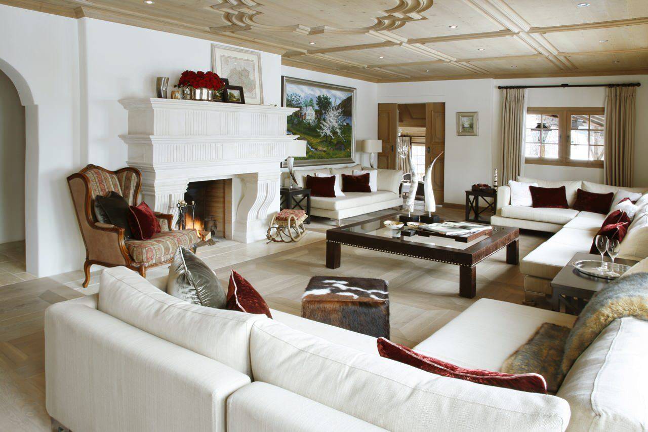 Гостиные шале создают теплую атмосферу домашнего огня. Доминирующие цвета — красный и зеленый. Стены из балок, деревянные полы и потолки, скрипучие лестницы и массивные, часто резные поручни — это основа горных интерьеров. Сердцем дома является, конечно же, камин — кирпичный, а чаще всего чугунный. Свечение огня дополнительно согревает интерьер и заставляет дом быть более уютным и безопасным.