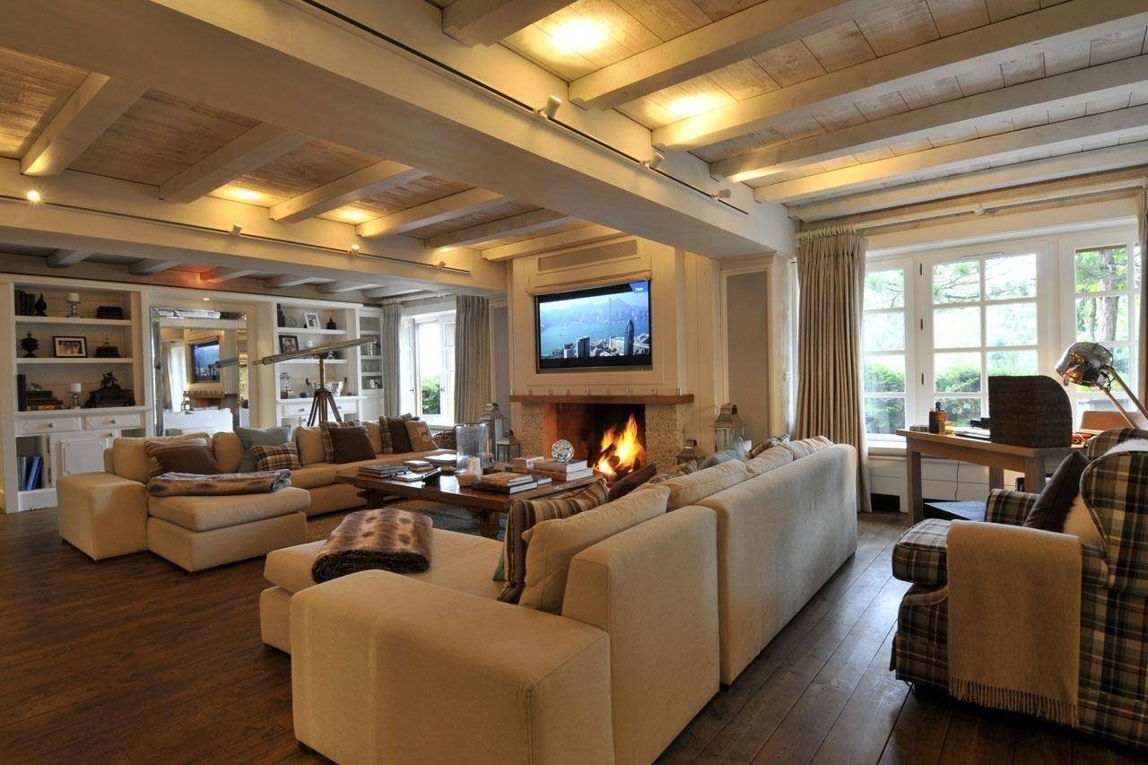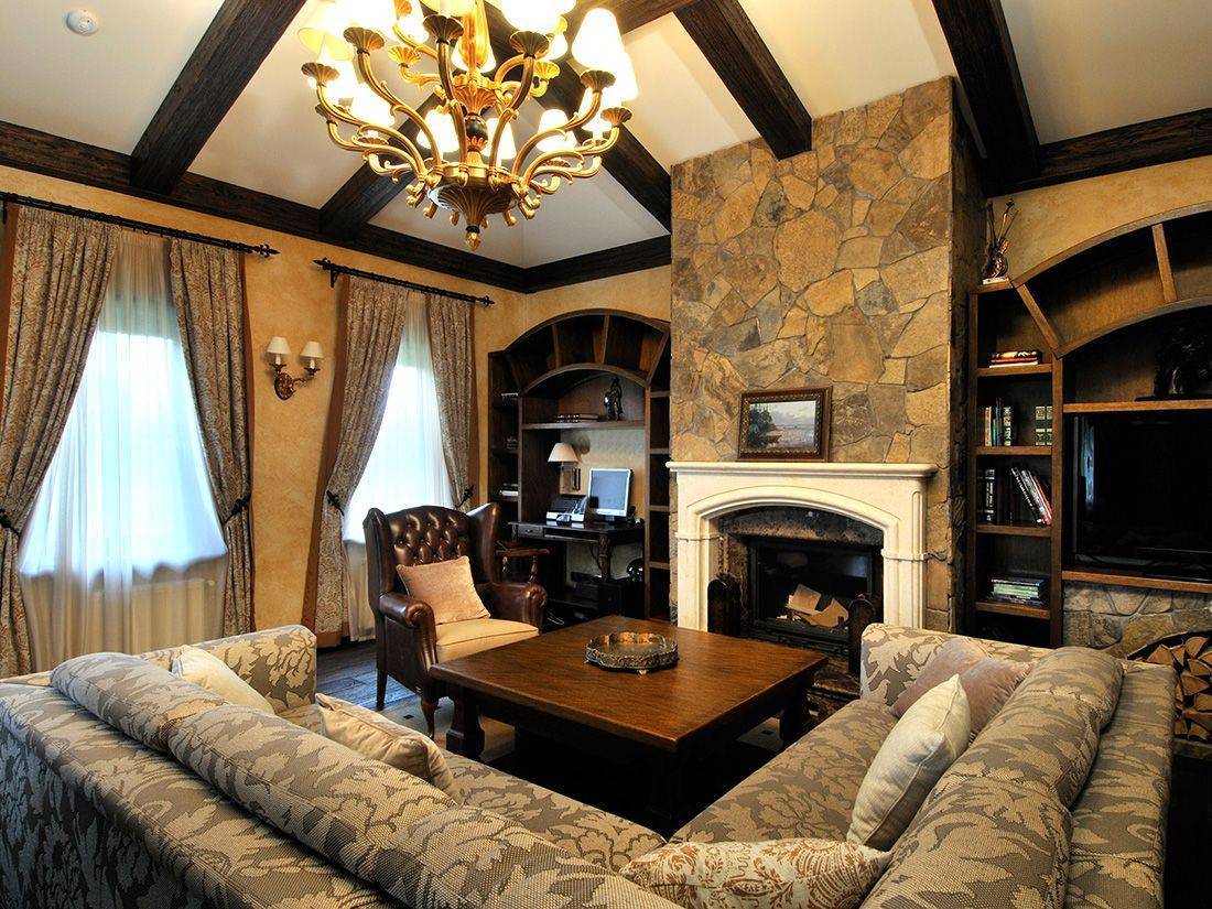Комната для приема гостей должна быть самым нарядным помещением дома. Обязательно наличие камина и мягкой мебели крупных размеров, чтобы посетители могли расслабиться. Кресло качалка и пуфики дополнят интерьер.
