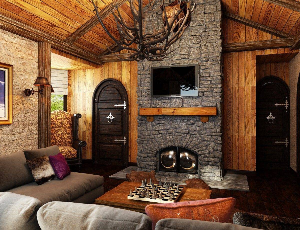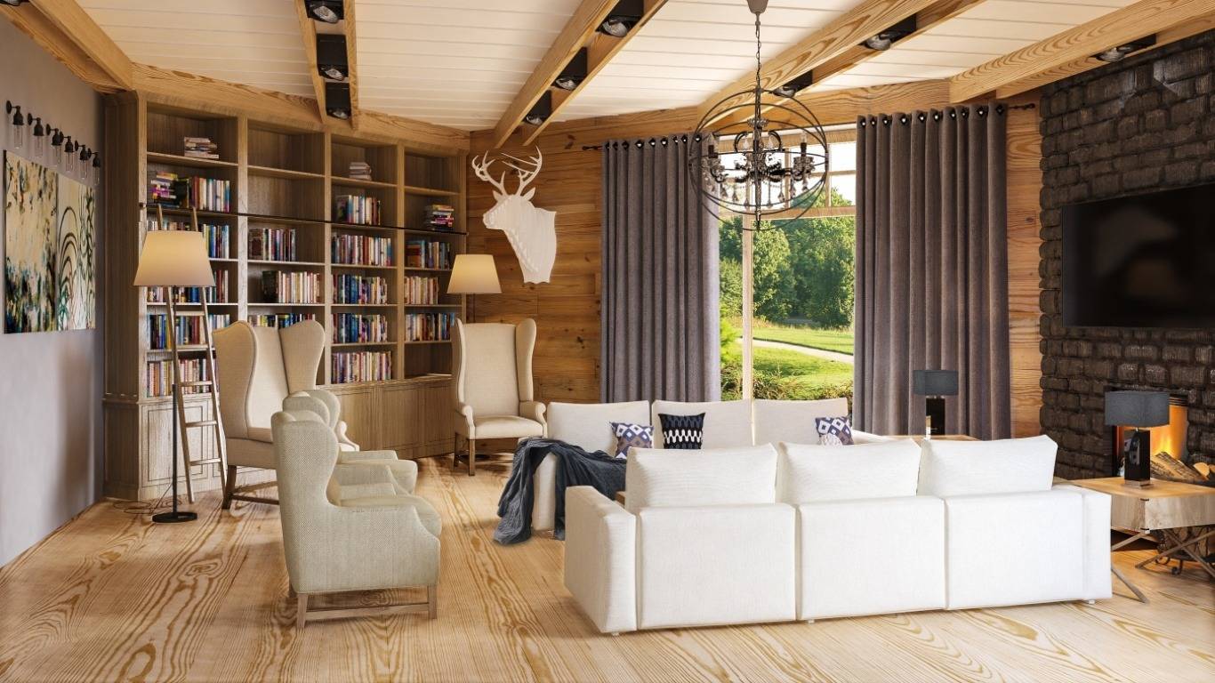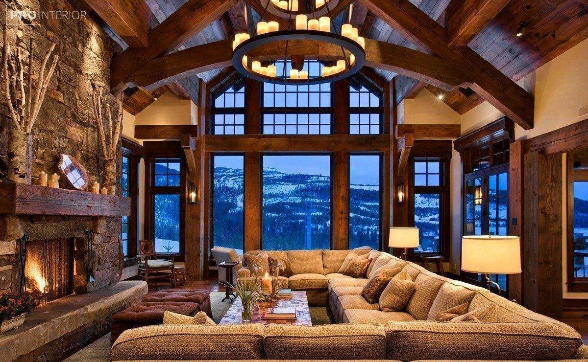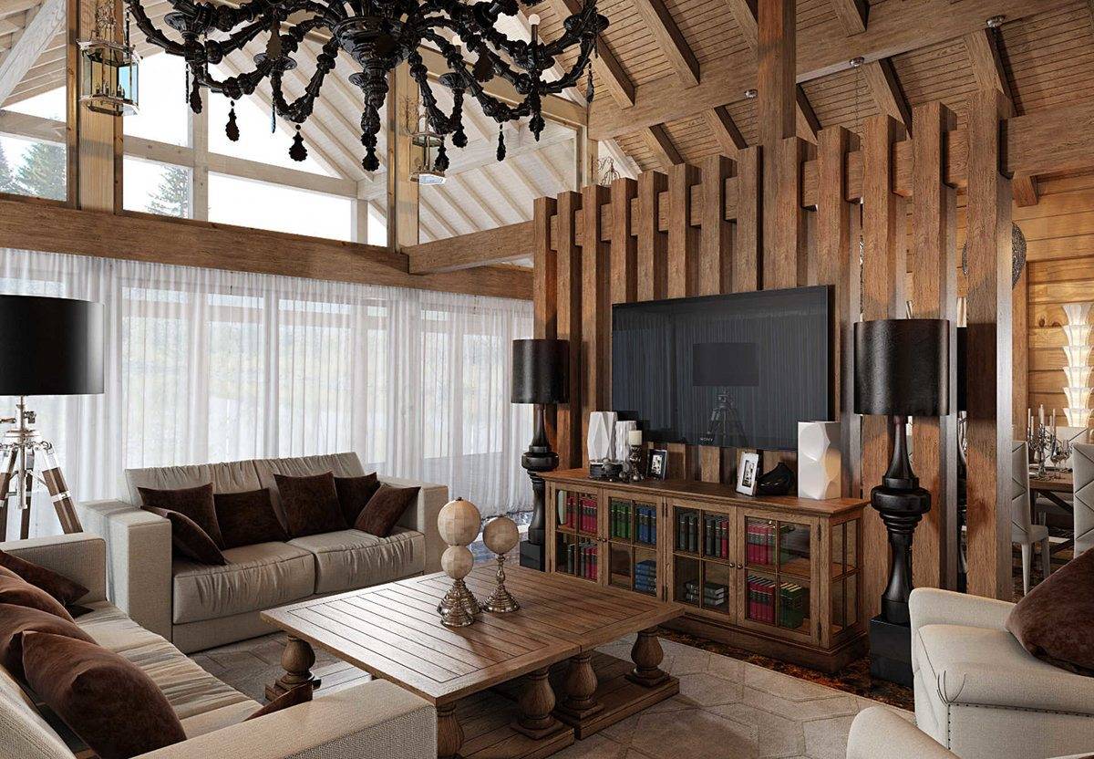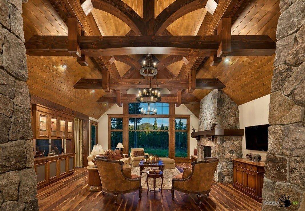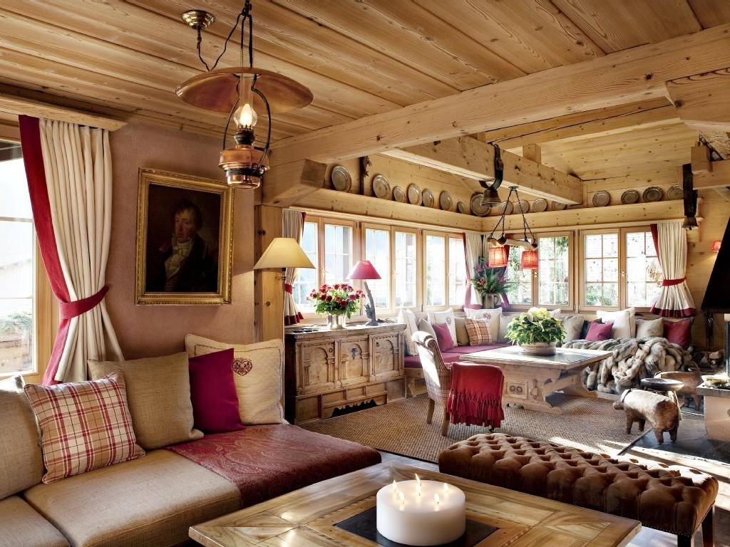Гостиная в стиле шале — дерево и изделия ручной работы