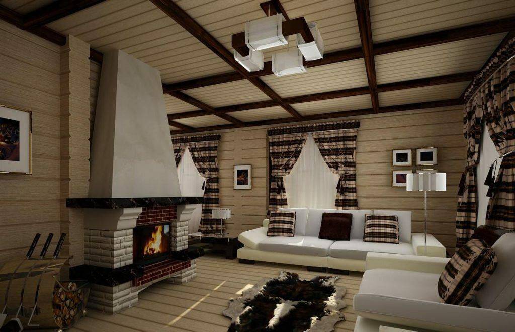 Благодаря добавлению красочного войлока, холста, хлопка, кожи и меха, например, пуфы, чехлы на стулья, подушки, вы можете достичь климата шале практически в любом интерьере гостиной. Красочные шторы подчеркнут атмосферу деревянного дома. Они чаще всего вешаются на железные или деревянные карнизы, лучше всего скрепленные скобами, привязанными липучкой или морщинистой лентой.