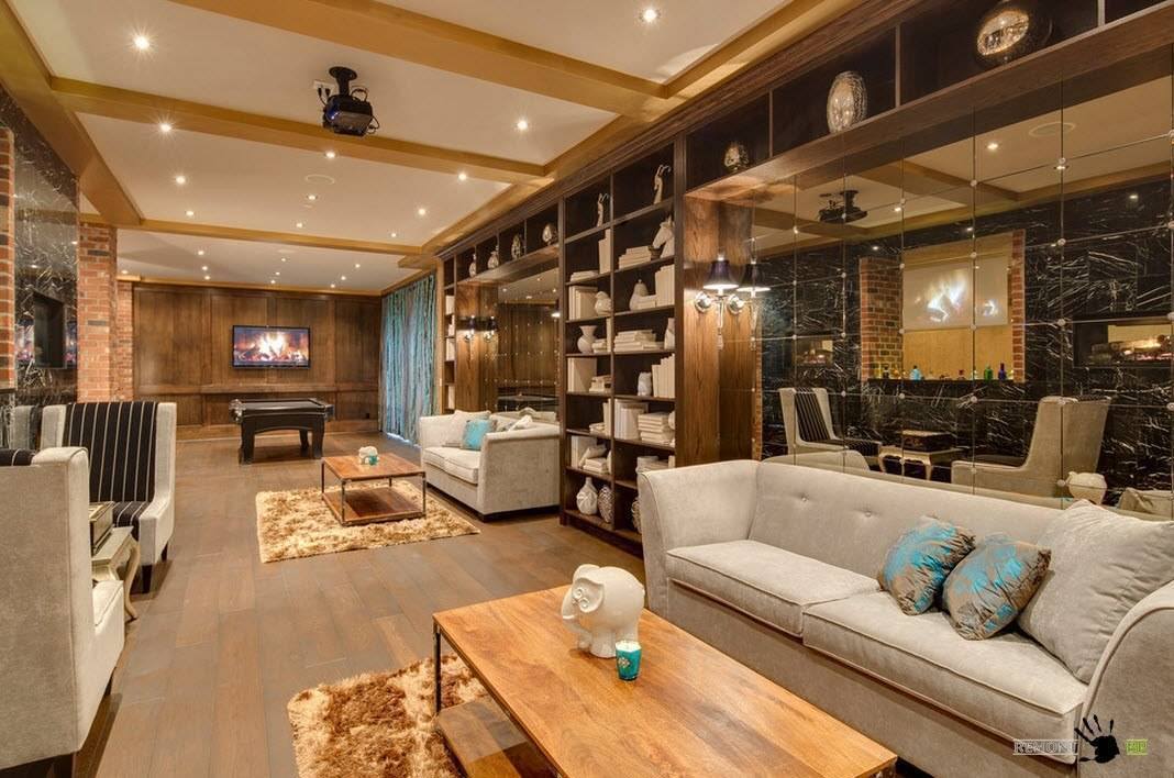 В элитных домах гостиные имеют большую площадь, что позволяет создать несколько локальных зон для различного времяпрепровождения. Можно создать обеденную зону с большим столом и стульями. Для обустройства дополнительной зоны для гостей стоит занять пространство мини-диванами или креслами.