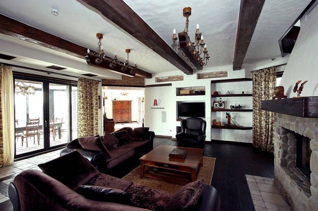 Отделка стен деревом, балки на потолке, деревянная мебель.