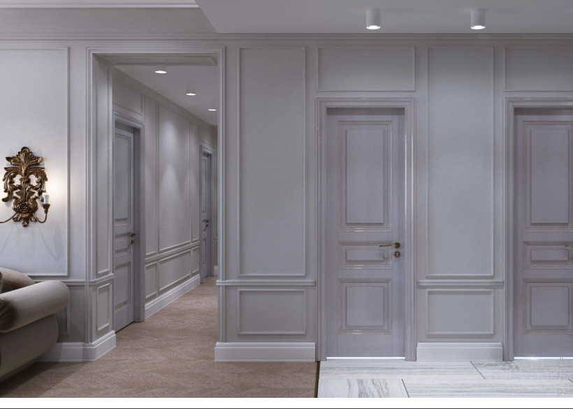 Для элегантной неоклассики подойдет умеренный декор настенными молдингами, отличающимися строгими геометрическими формами и ненавязчивыми орнаментами.