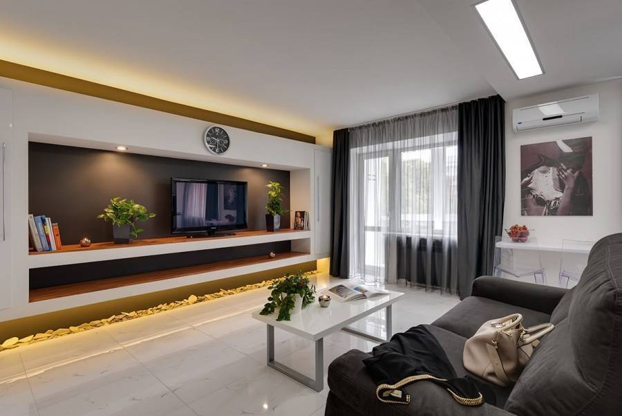 В этом случае зонирование не нужно. Достаточно освободить комнату и сделать ее просторнее. Кроме этого, рекомендуется наполнить комнату искусственным светом. Для минимализма подходят точечные светильники. Они вообще не занимают места и дают ровный дневной свет.