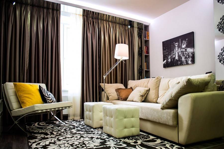 Интерьер квартиры с основной гостиной может основываться на условных стенах. Самый простой способ отделить ее – диван, расположенный спинкой ко всей остальной комнате.