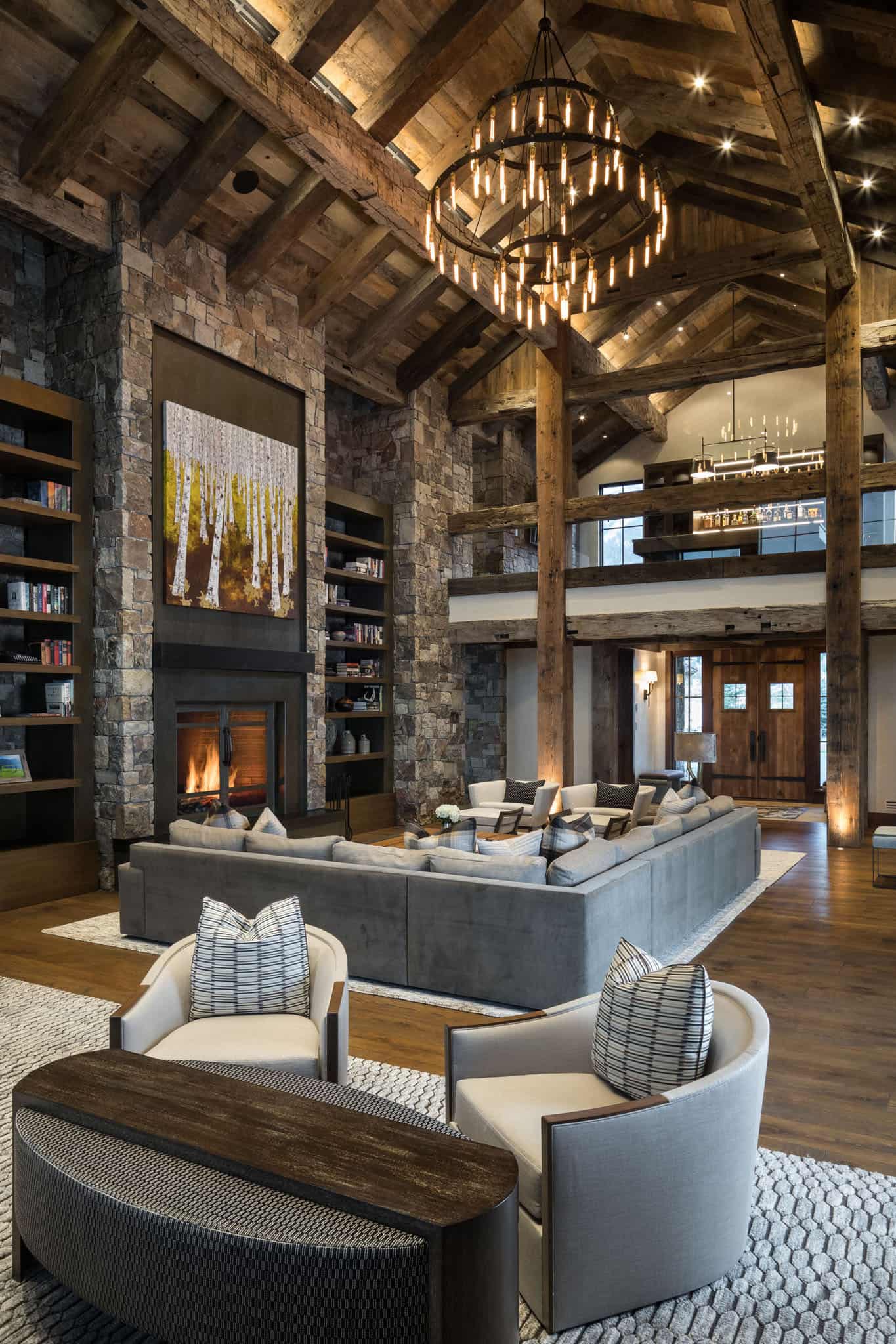 Массивная мягкая мебель и камин — важные элементы гостиной в стиле шале