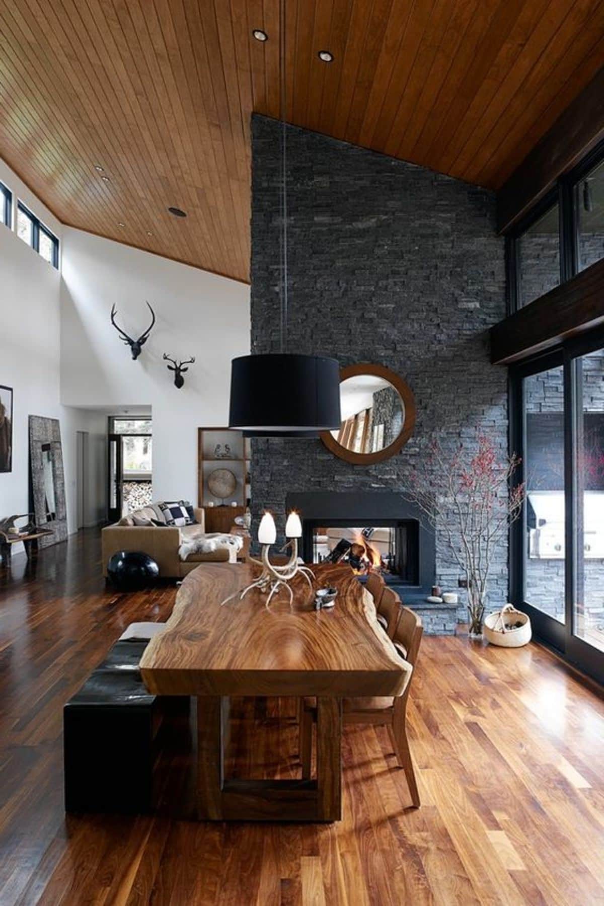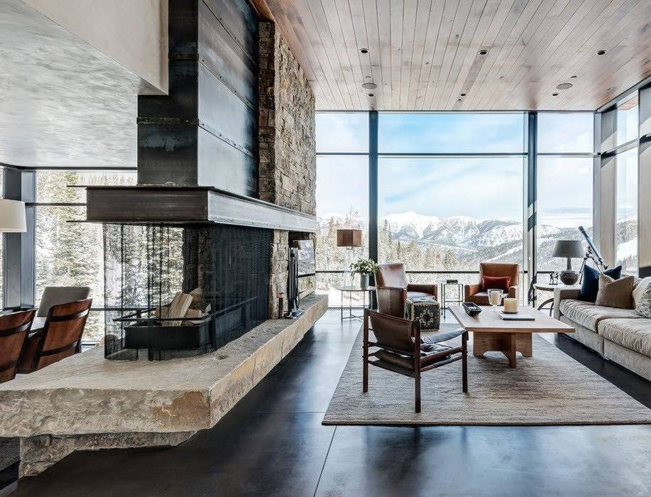 Центральный элемент альпийского дома — это большой, каменный, украшенный резьбой по дереву или коваными узорами камин. Без него интерьер убежища в горах будет незаконченным.