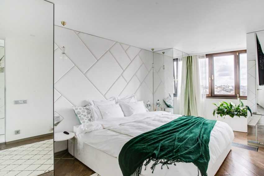 На фото спальня 17 кв. в стиле современная классика, где зеркальная стена позади кровати гармонирует с рамами французских окон.