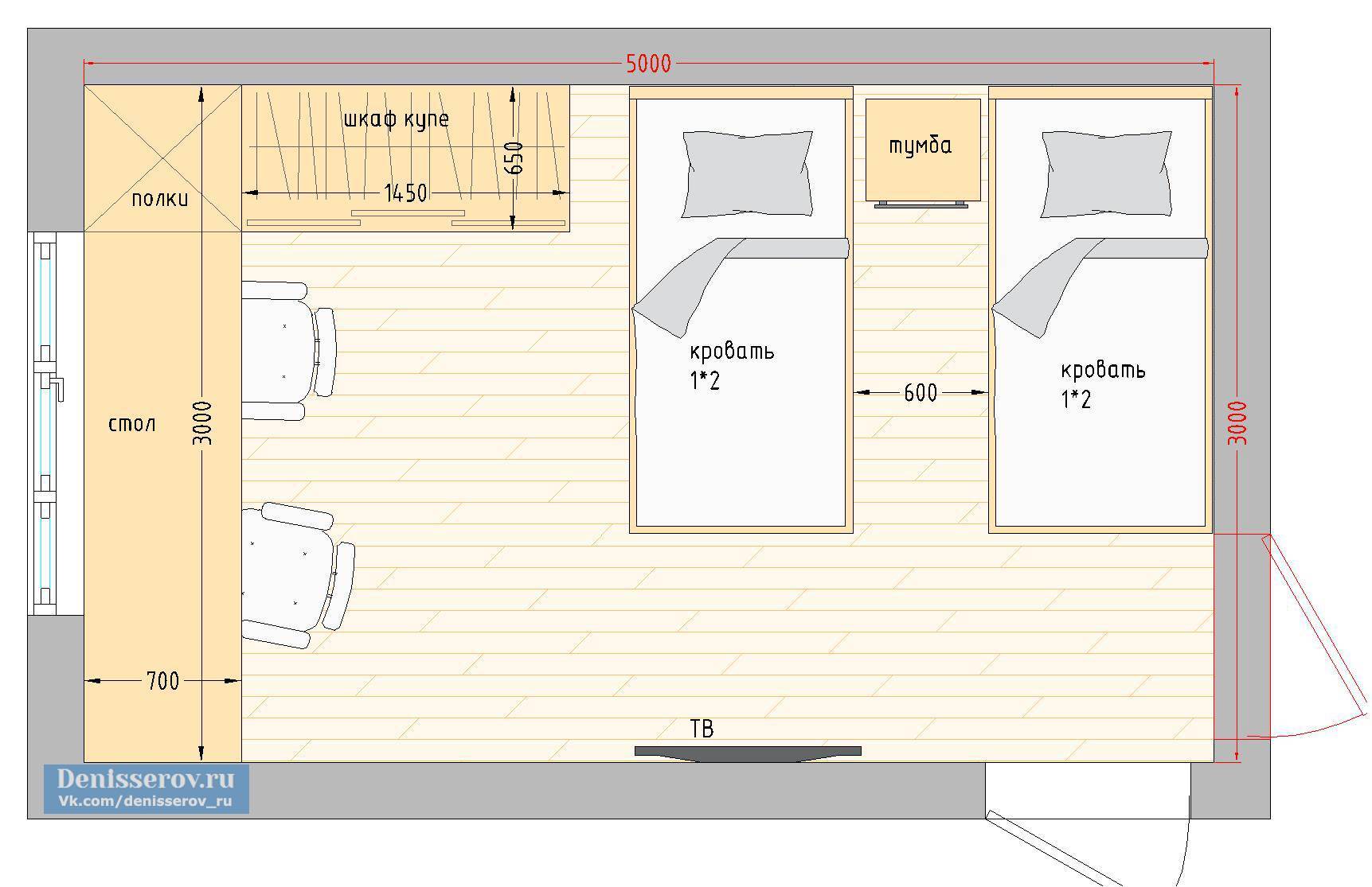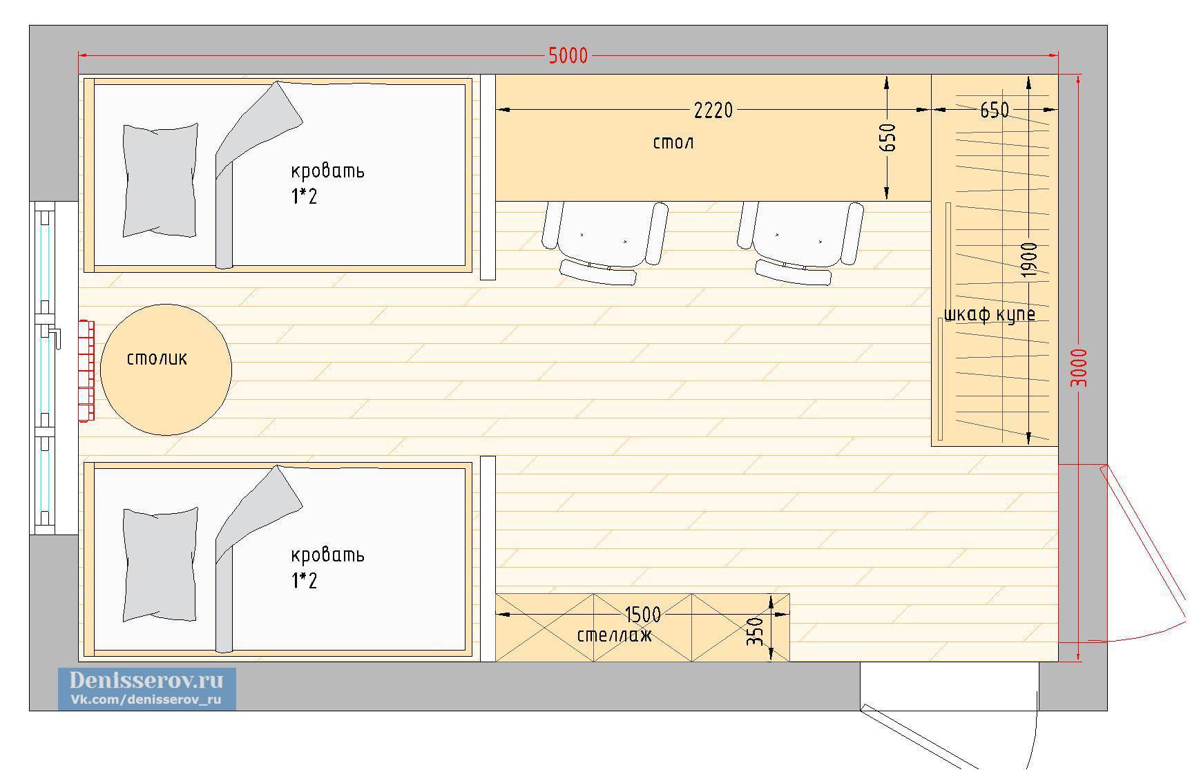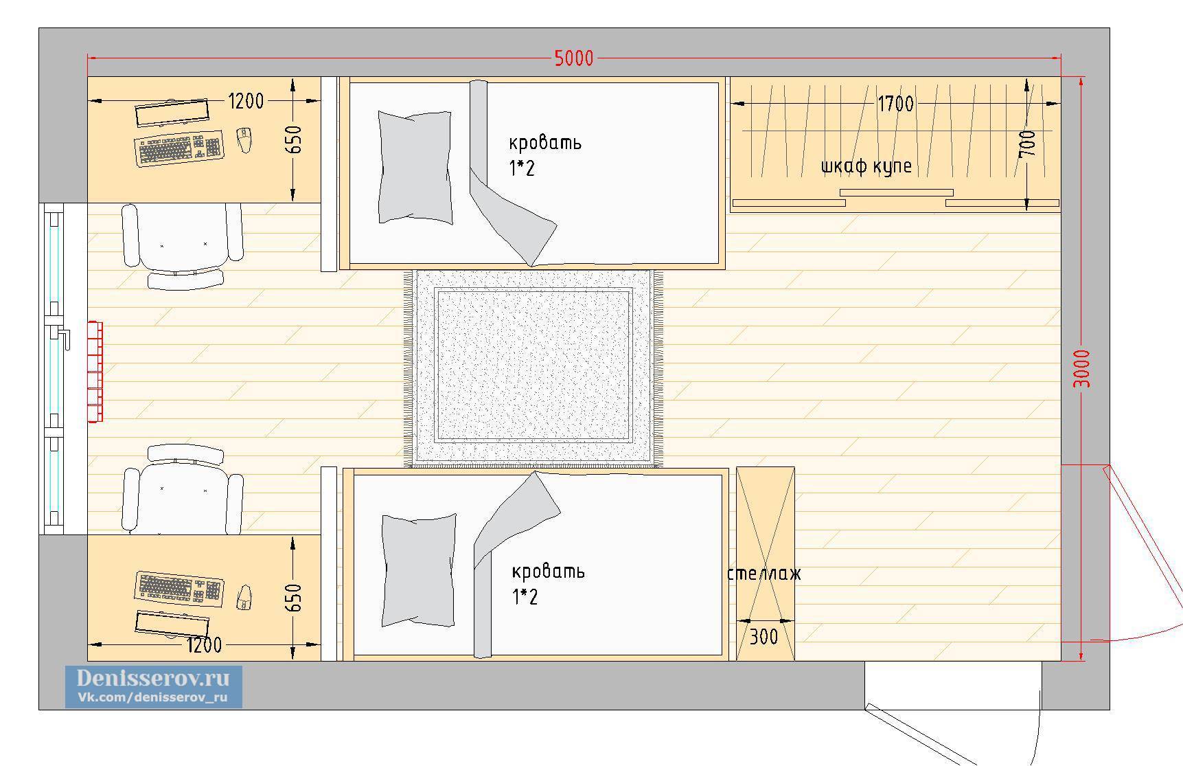 Столы для занятий ставят с двух сторон у окна. В детской для двоих 15 кв. м. кровати располагают у стены в центре комнаты. Напротив входа будет встроена вместительная система хранения.