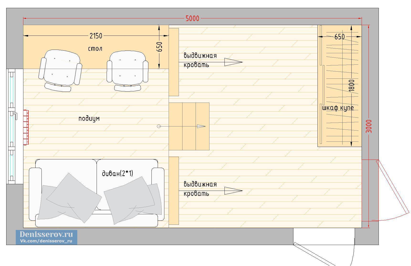 Если вход расположен напротив окна, то с двух сторон возле него ставят кровати. Все остальные предметы расставляют буквой «П». Для детской комнаты заказывают и выдвижные конструкции, которые легко скрываются под подиумом.