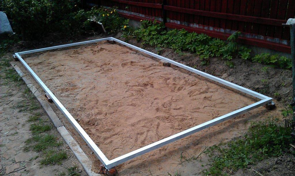 Для этого делают замеры, ставят разметки по периметру и снимают поверхность почвы на глубину приблизительно в 0,2 метра. После это место углубления наполовину засыпается песком или гравием, которые необходимо тщательно утрамбовать.