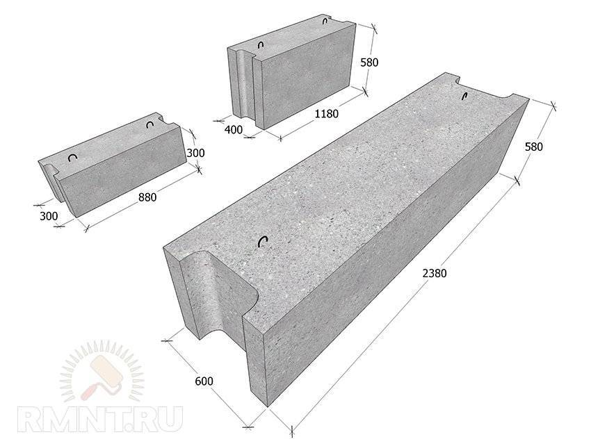 В частном строительстве применяют несколько типов блоков. Для устройства ленточного сборного фундамента чаще всего используют только два вида: