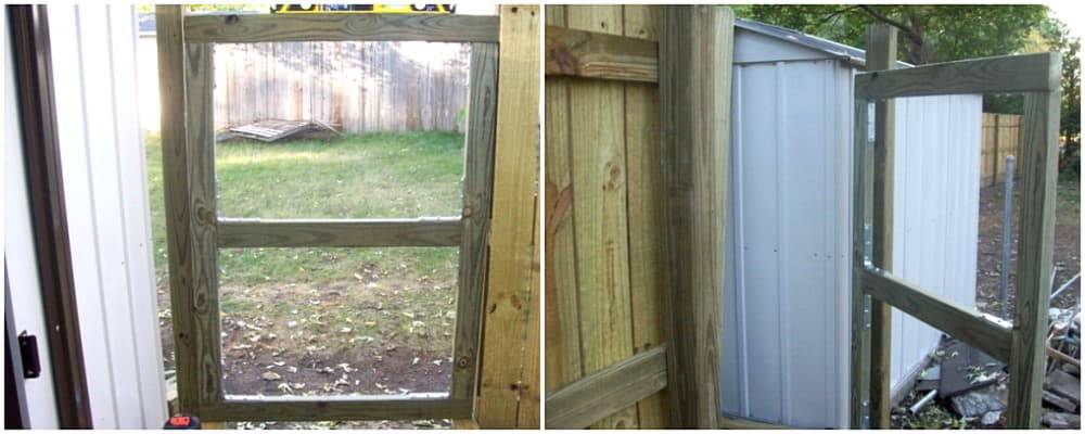 Зафиксировать раму к петлям, обшить ее досками. Первая заготовка устанавливается к опоре, которая выставляется по уровню.