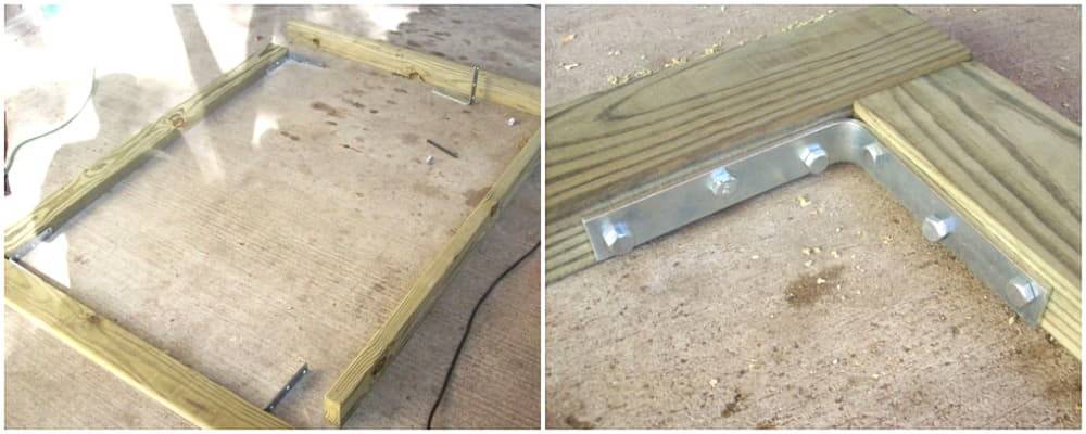 Из бруса или доску толщиной 40-50 мм нарезают элементы рамы. Соединяют замком шип-паз с дополнительным креплением болтами или саморезами. Можно усилить углы металлическими накладками.
