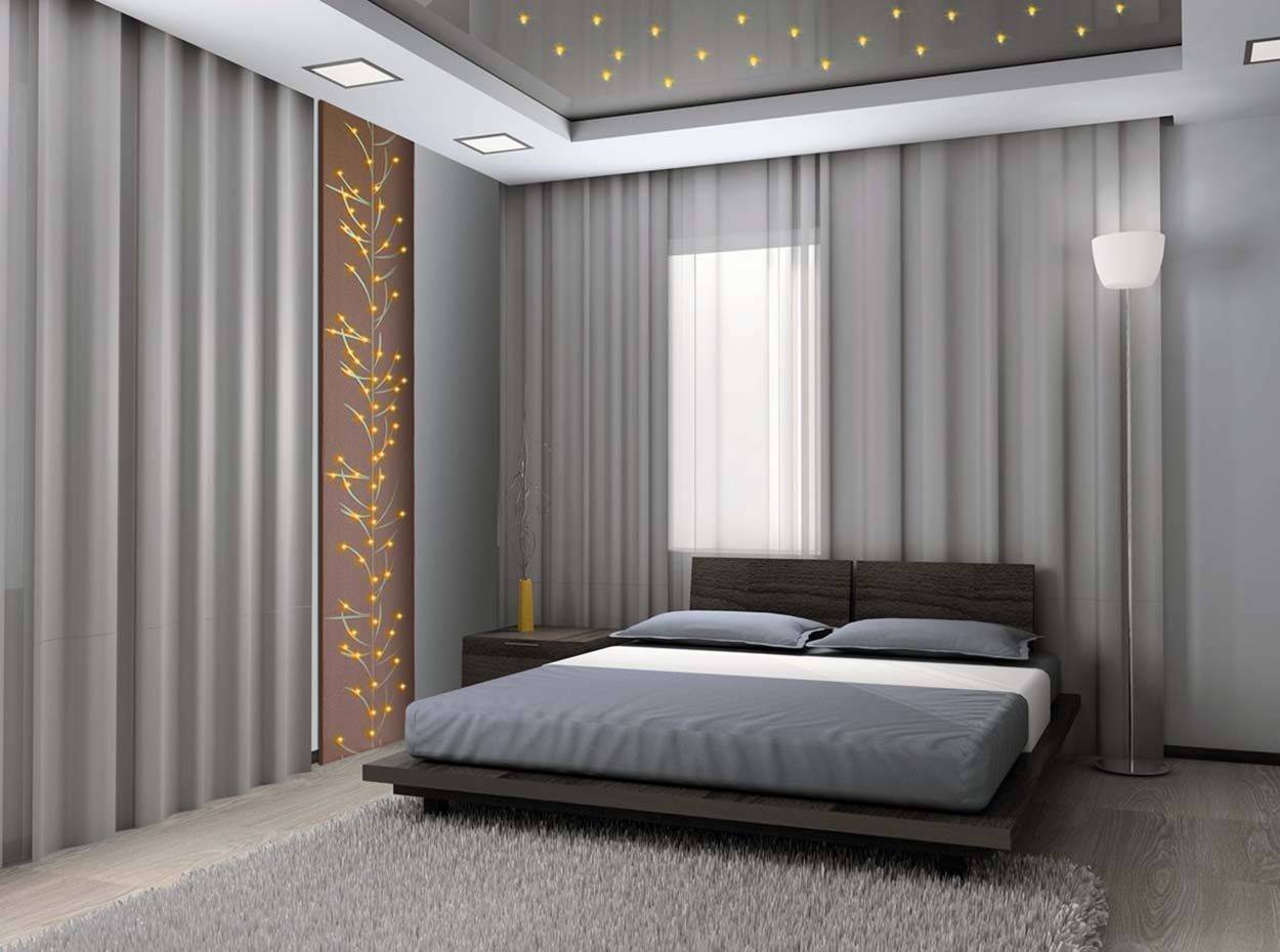 Интерьер спальни в темных тонах требует хорошо продуманного освещения.