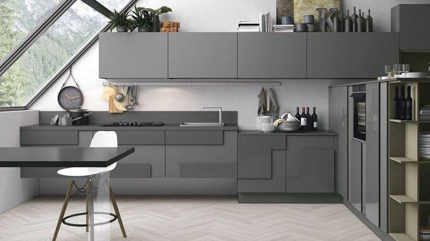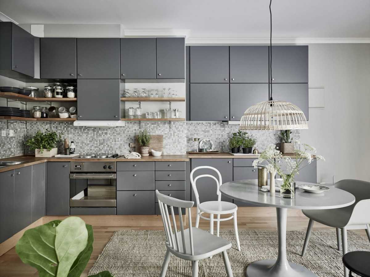 Серый цвет на кухне считается одним из самых практичных и в то же время нейтральных, именно поэтому следует обратить внимание на него. Он не выгорает, на нем практически не видна пыль, брызги воды и жира