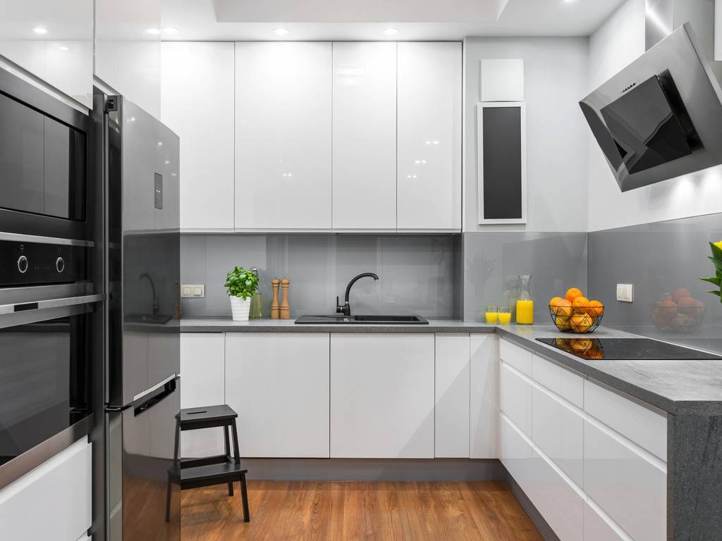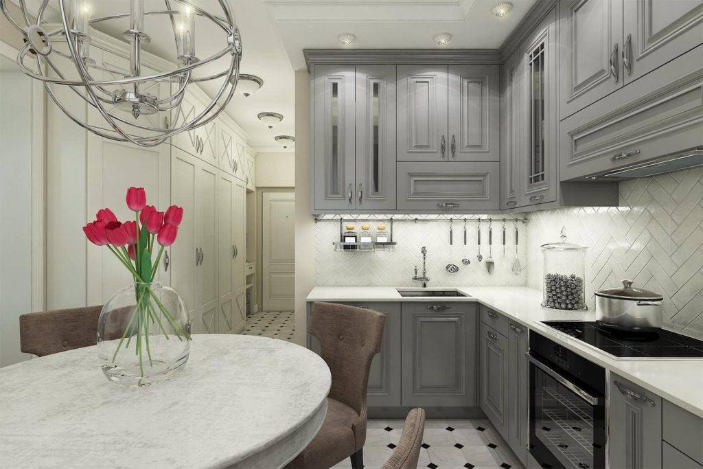 Для небольших кухонь выбирайте прохладные серые цвета. Потолок лучше сделать очень светлым, даже белым. Также можно брать такие оттенки: кремовый, жемчужно-серый, молочно-серый, бежевый, серебристый. Голубая и бежевая палитры зрительно увеличат площадь. Фасады мебели, столешницу и фартук сделайте светлыми. Для небольших кухонь подойдут гарнитуры со светло серыми или серебристыми глянцевыми фасадами. Они выглядят более легкими и визуально добавляют пространство. Стол можно заменить на барную стойку. Выбирая стиль для интерьера, отдавайте предпочтение минимализму, классике или скандинавскому стилю.
