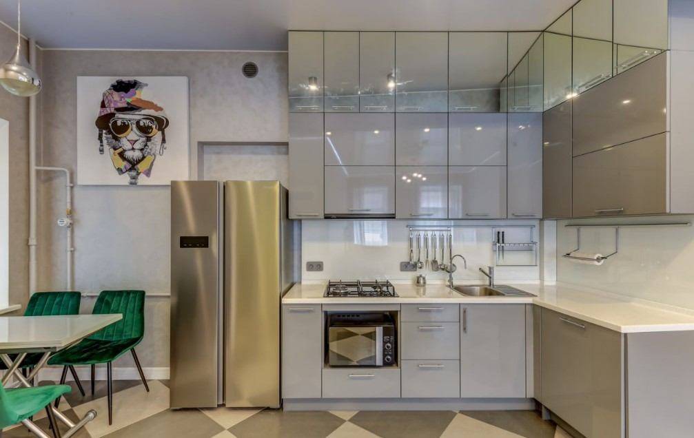 Всевозможные варианты сочетания серого и зелёного цветов особенно шикарно смотрятся в глянцевом исполнении и станут идеальным решением для создания интерьера кухни в одном из современных стилей. Среди популярных оттенков серого в таком примере можно выделить металлик или дымчатый. Что касается зелёного, то в этом дуэте он может присутствовать в виде болотных, травяных либо изумрудных оттенков. При этом не стоит забывать, что главенствующим остаётся серый, а зелёный используется для расстановки акцентов в помещении.