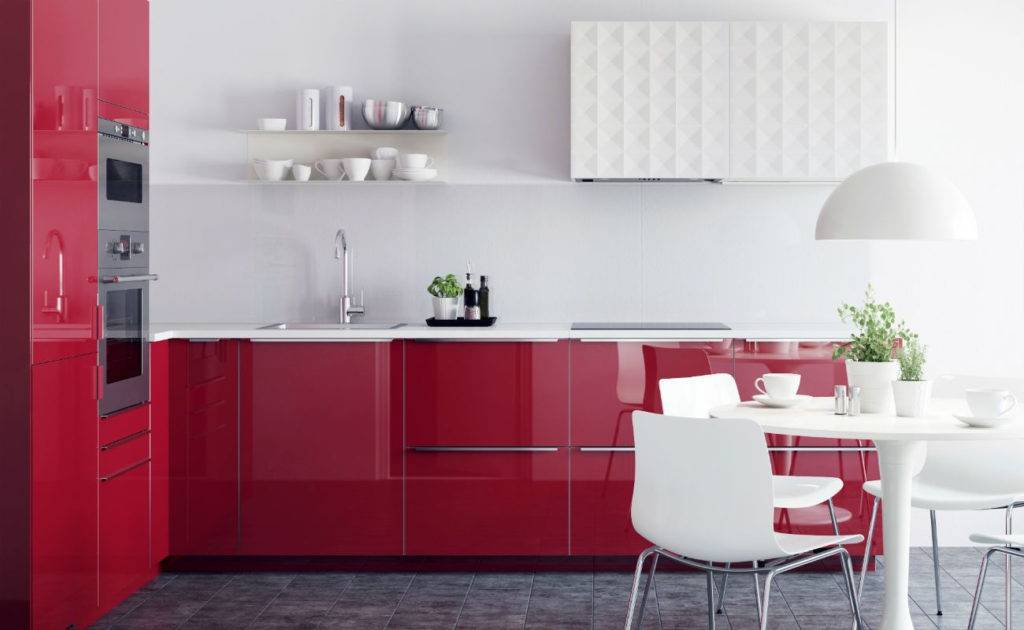 Насыщенные гранатовые оттенки визуально достаточно емкие — они занимают немало места, поэтому их применение в небольших помещениях ограничено. В скромной кухне лучше предпочесть яркие акценты: в светлом интерьере детали бордового цвета придадут обстановке динамики и эмоциональности, в то время как нейтральный фон зрительно расширит пространство.