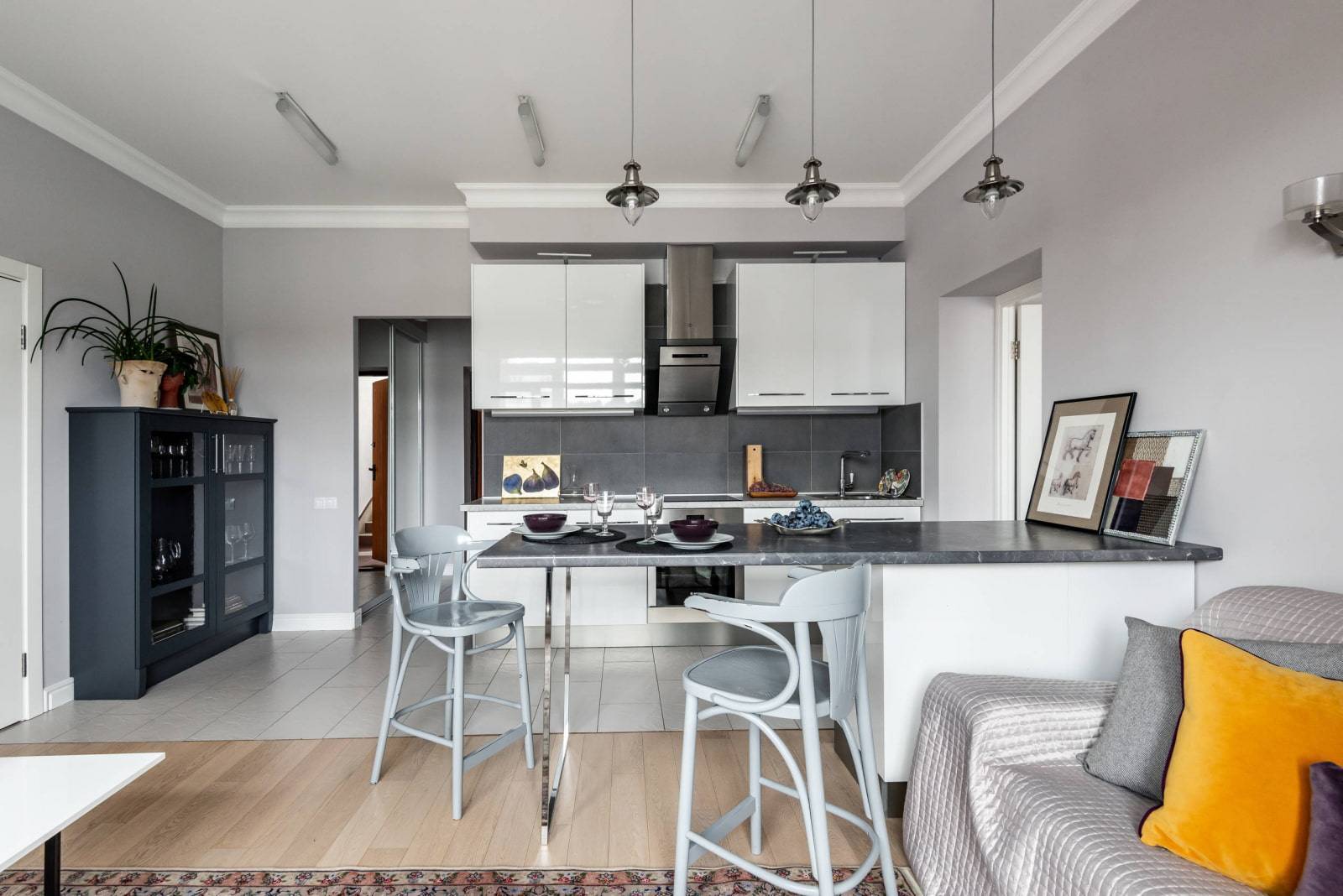 В «противовес» яркой дизайнерской люстре, украшающей столовую зону, противоположная часть кухни, где расположен кухонный гарнитур, выглядит максимально лаконично. Такой эффект достигается благодаря минималистичным кухонным фасадам холодного светло-серого оттенка.