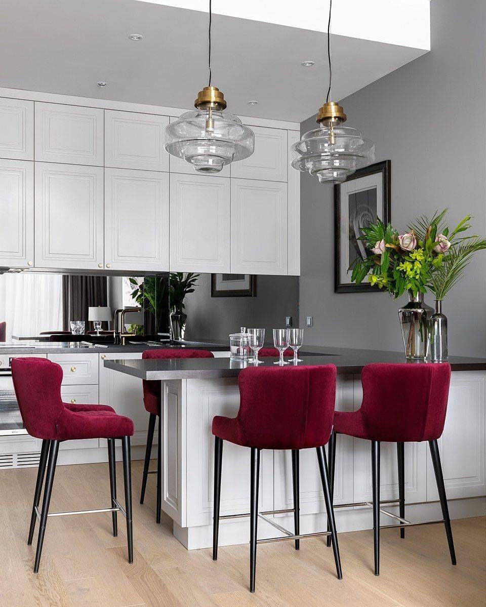Если раньше к серой кухне добавлялись «пятна» чистого цвета, то сейчас дизайнеры стали использовать «низко-насыщенные» колеры, разбавляя их серым. Не менее впечатляюще будут смотреться акцентные плафоны.