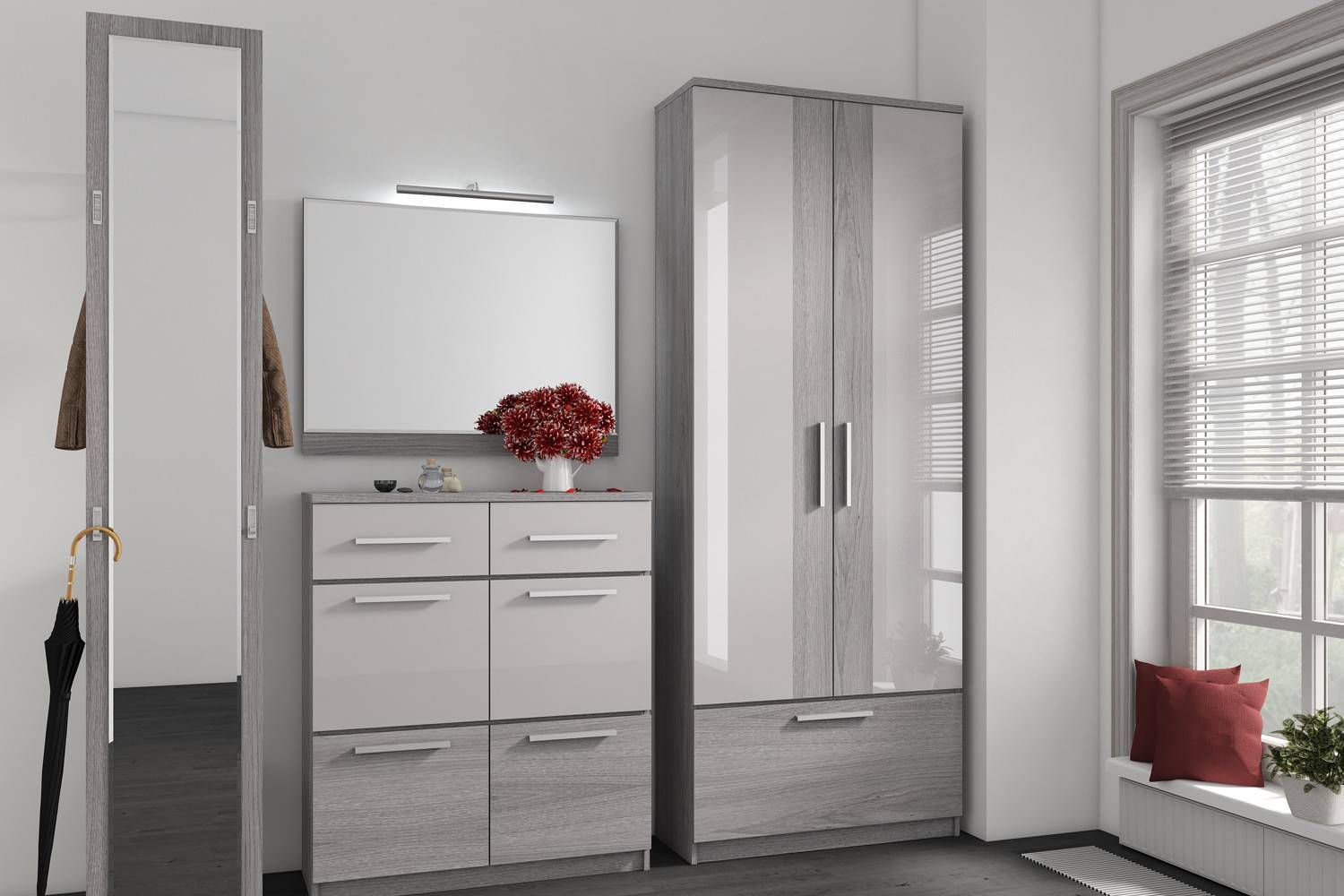 Ищете предмет мебели, который выполняет сразу несколько функций? На рынке вы найдете интересные решения в виде шкафов, соединенных со скамейками с помощью стены, на которой уже есть вешалка и зеркало. Такой комплект идеально подойдет, если серая прихожая не слишком просторная, и вы хотите, чтобы она оставалась функциональной.