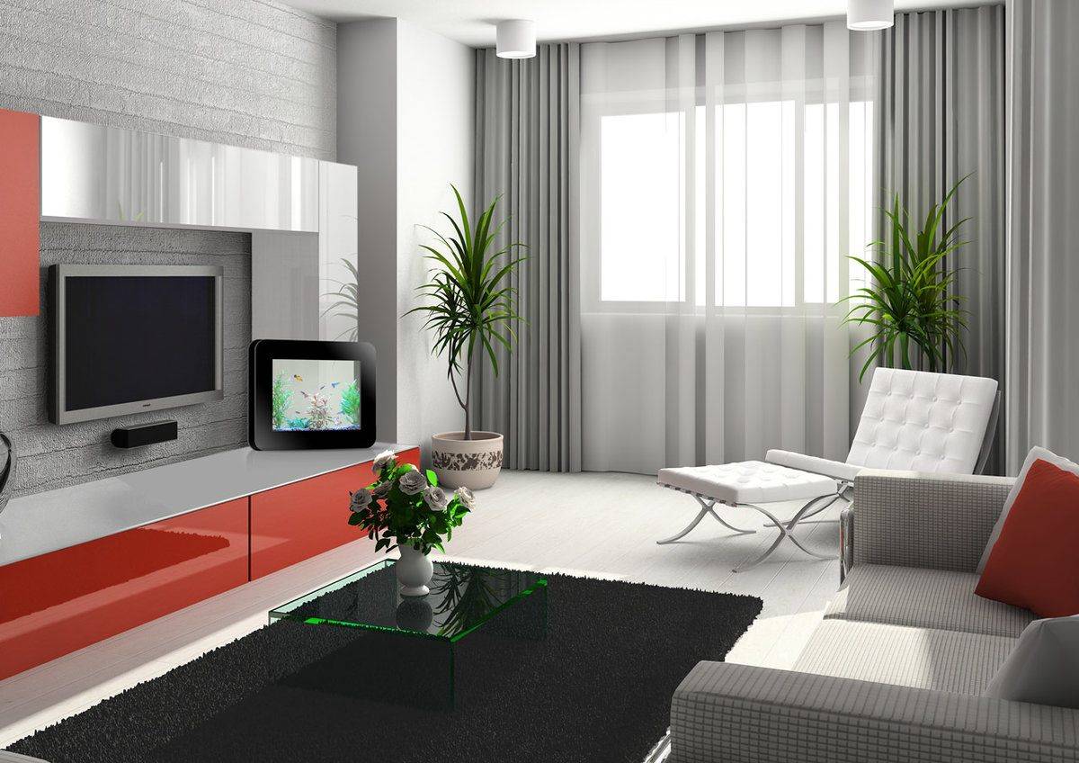 В небольшом помещении часто ощущается недостаток свободных метров. Чтобы гостиная не выглядела захламленной, стоит оформить пространство в лаконичный минимализм. Визуально расширить комнату поможет воздушный бежевый или светло-серый цвет. Чтобы зал не выглядел унылым, дизайнеры рекомендуют 2-3 акцентные детали. Разбавить скуку белого можно при помощи черного или графитового.