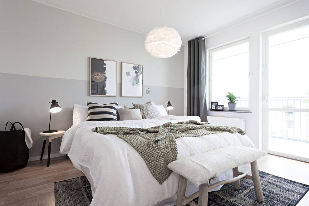 Национальный стиль предполагает белое оформление комнаты. Светлый фон перекликается с теплым коричневым на полу и серым в мебели. Разбавить стерильность скандинавского дизайна помогают яркие акценты в текстиле, аксессуарах. Декор привносит в интерьер ощущение домашнего уюта.