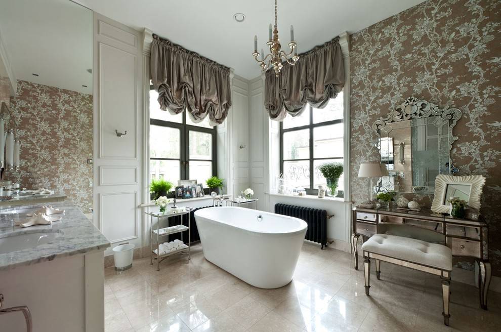 Роскошный стиль естественно смотрится в приглушенной гамме (беж, голубой, серый). В интерьере обыгрывают полутона из одной палитры, использую не более 4 цветов. Поверхности украшают позолотой, резьбой или растительным орнаментом. Для светлого интерьера уместно оформление стен и потолка белым.
