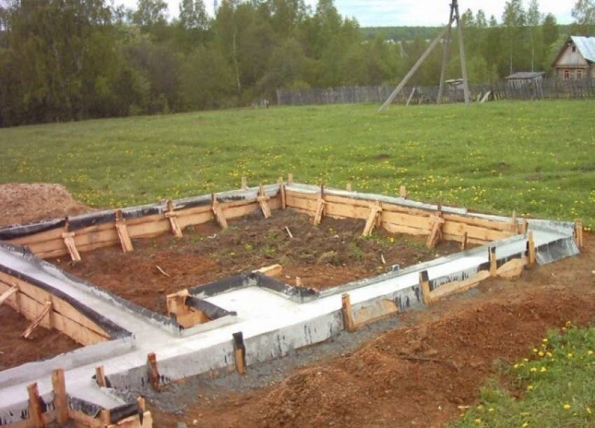 Через 25-30 дней, когда фундамент наберет достаточную прочность, его присыпают слоем песка 3-5 см и накрывают рубероидом для гидроизоляции.