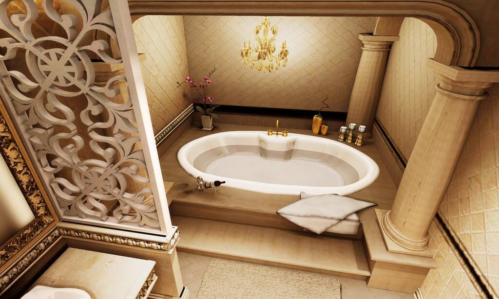 Это самый дорогой из всех перечисленных вариантов, однако, самый элегантный и роскошный из них. Для оформления комнаты в этом стиле необходимо использовать только натуральные материалы – дерево (водоустойчивое), камень, отделку в позолоте и других дорогих металлах, сантехнику из фарфора.