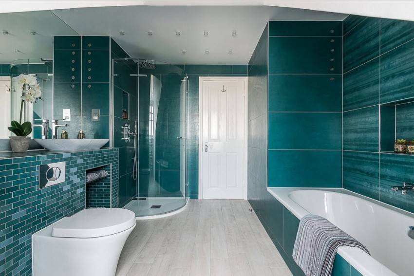 Ванная в плитке выглядит изящно и стильно. Варианты отделочных материалов для комбинирования: