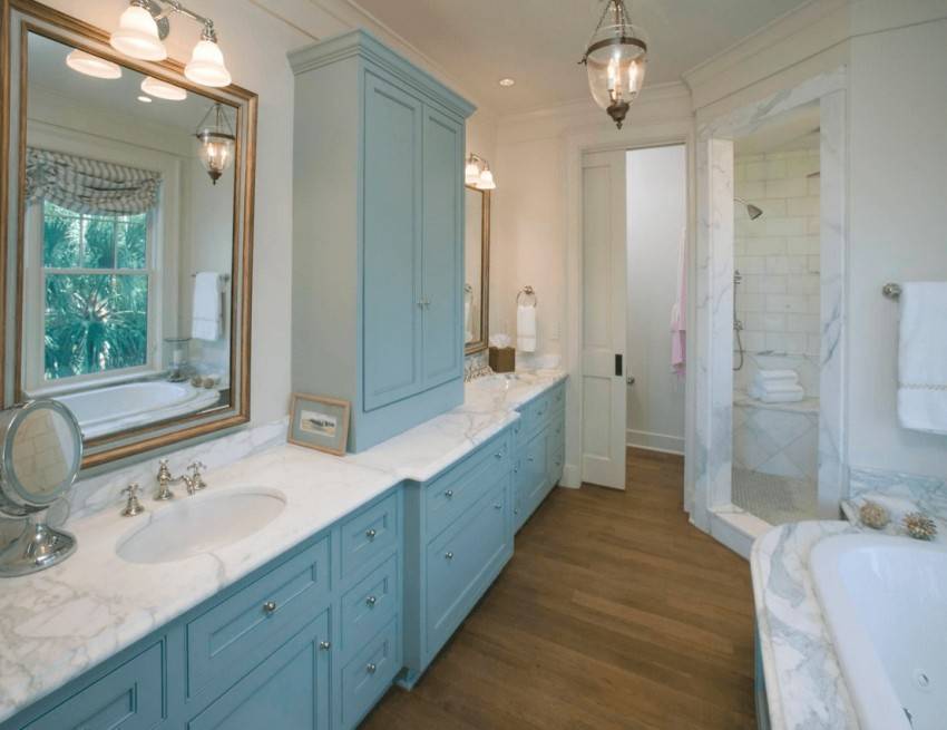 Существует огромное количество архитектурных стилей, в которые вписывается ванная синих оттенков. Вот далеко не весь перечень стилевых направлений, подходящих этому цвету: