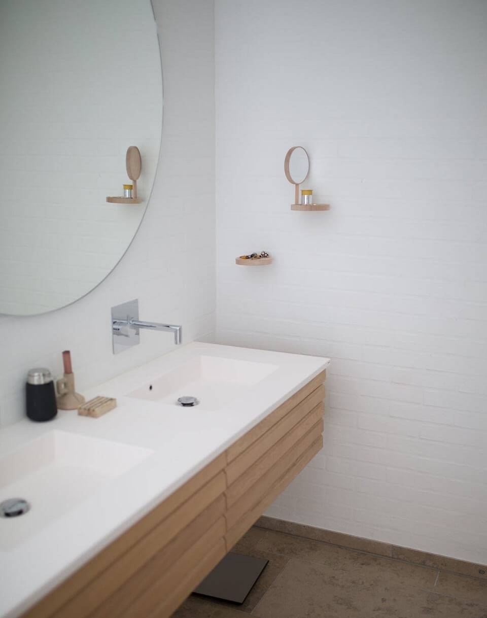 Сочетание белой кирпичной кладки стен с полом оттенка капучино.