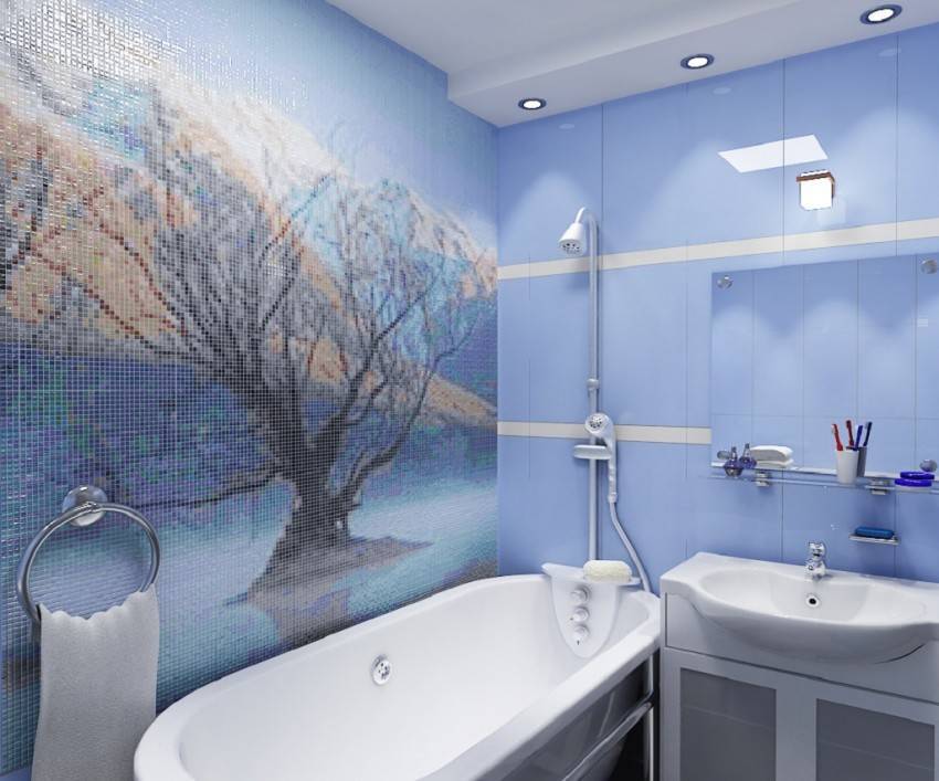 Использование мозаичных панно. Мозаика может быть выложена как в сюжеты или картины, так и абстрактно переливаться оттенками синего, белого и голубого цветов.