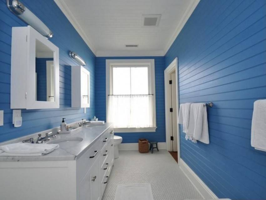 Не стоит игнорировать сочетание синих оттенков между собой. Для ванной комнаты можно подобрать 2 или 3 оттенка синего цвета, которые будут контрастировать между собой.
