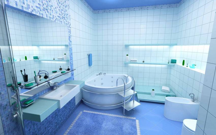 Отдых и релаксация в голубом цвете ванной комнаты К основным достоинствам голубого цвета в ванной относят: