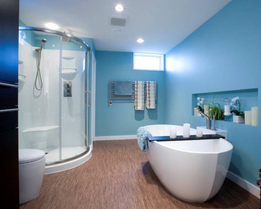 В ванную комнату в голубых тонах лучше подбирать светлые оттенки голубого для расширения пространства. В просторных комнатах допустимы цвета от нежно-голубого до густой синевы. Таким образом, дизайнеры добиваются глубины интерьера, разных образов и стилей.