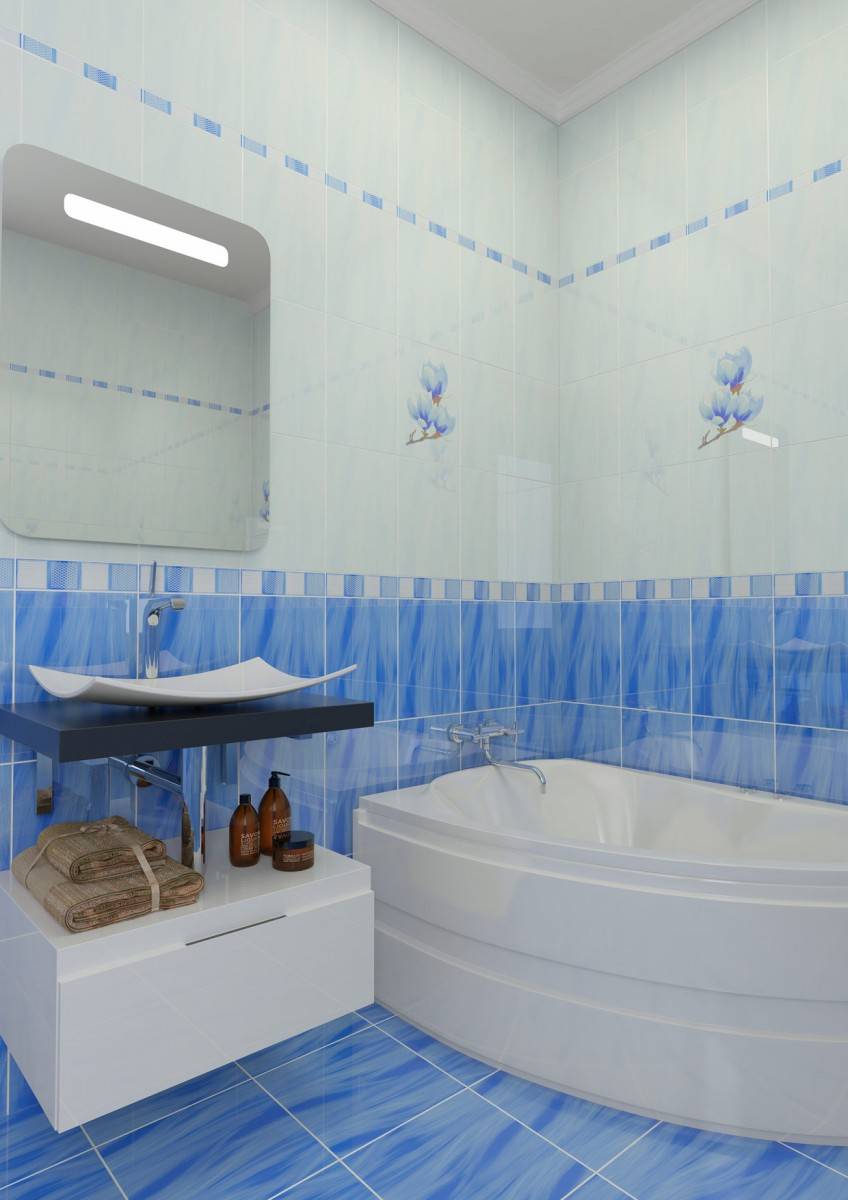 Выбирая плитку, лучше отказаться от блестящих, глянцевых поверхностей. Конечно, такая плитка наполнит ванную светом, но и усилит «холодное» впечатление от комнаты. Хорошо будут смотреться матовая керамика с блестящим серебряным декором. А вот специфика голубого цвета позволяет уйти от традиционной привязки размера плитки к площади помещения.