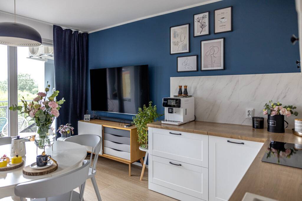 Другая распространённая ошибка – заполнение всей квартиры синим цветом. Выделите только одну комнату, в которой будут насыщенные яркие стены, а в других добавляйте лишь отдельные предметы декора: подушки, ковры, картины в цветных рамах и цветочные горшки.