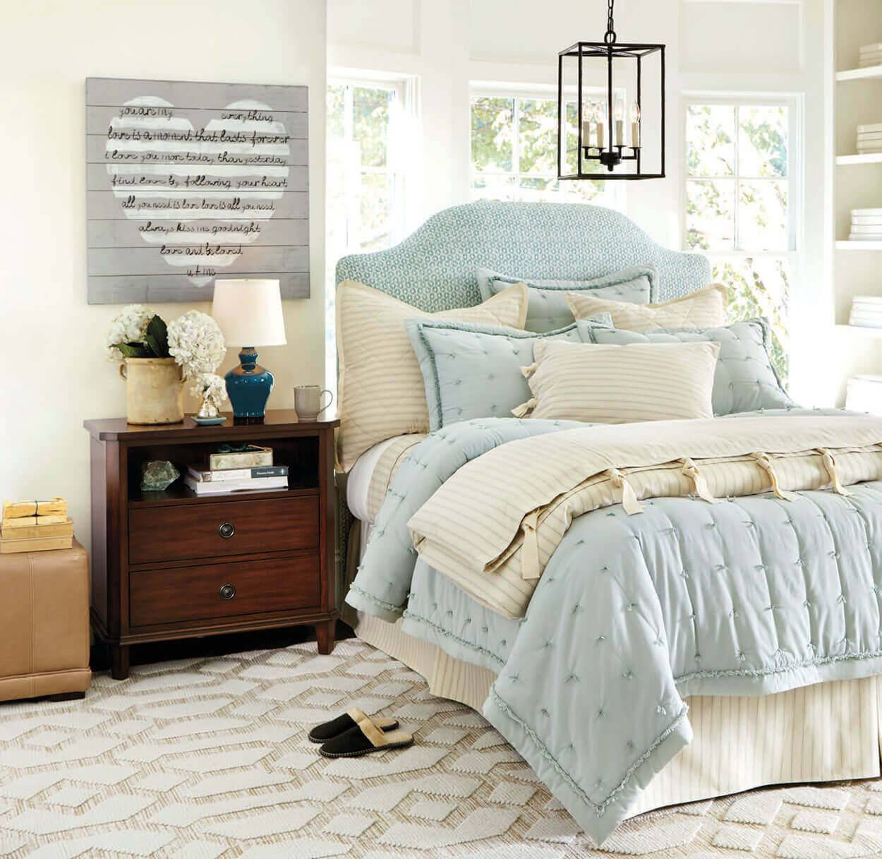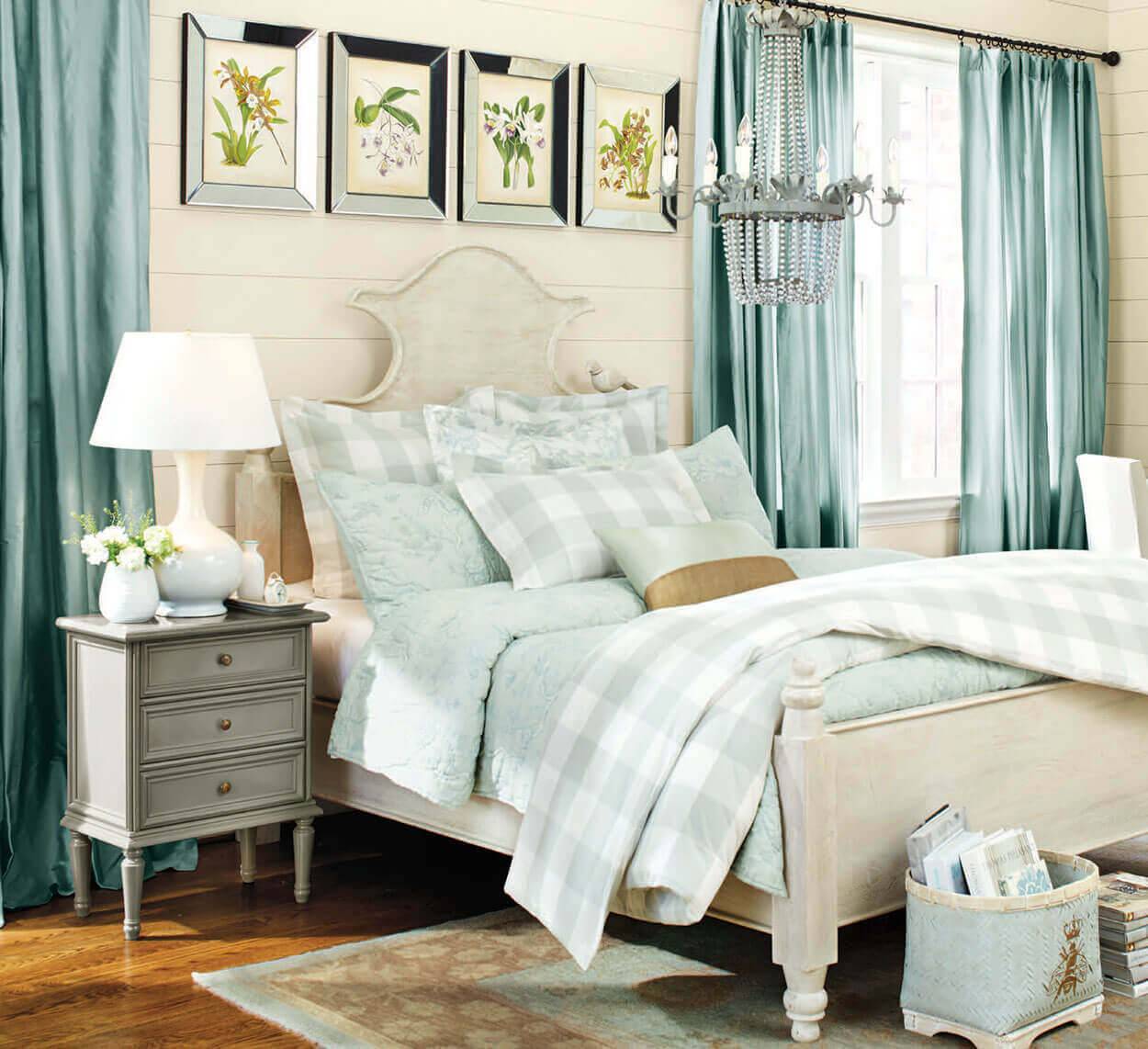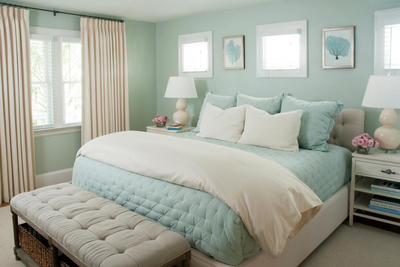 Бледные оттенки голубого, рассмотренные на примере выше, придают спальне изысканное очарование и создают успокаивающий эффект.